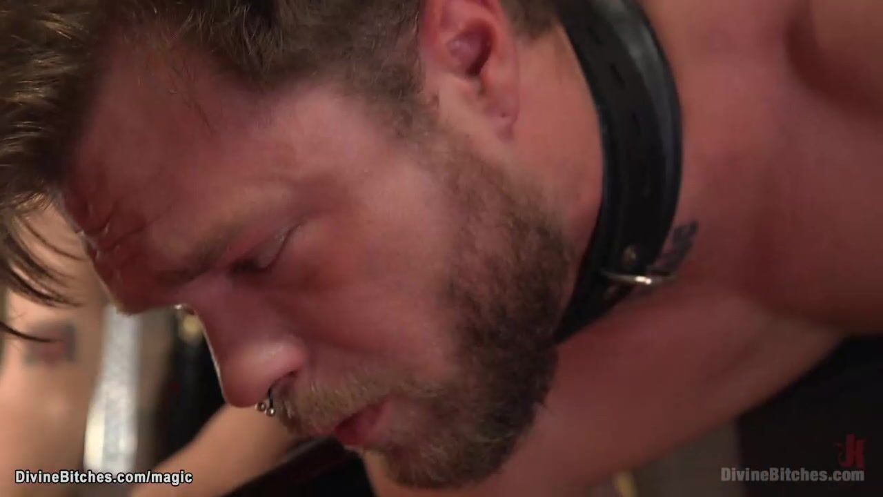 Brunette femdom in latex Joey Minx spanks and whips tattooed slave Mike Panic then puts him lipstick and makes him fuck her with dildo gag