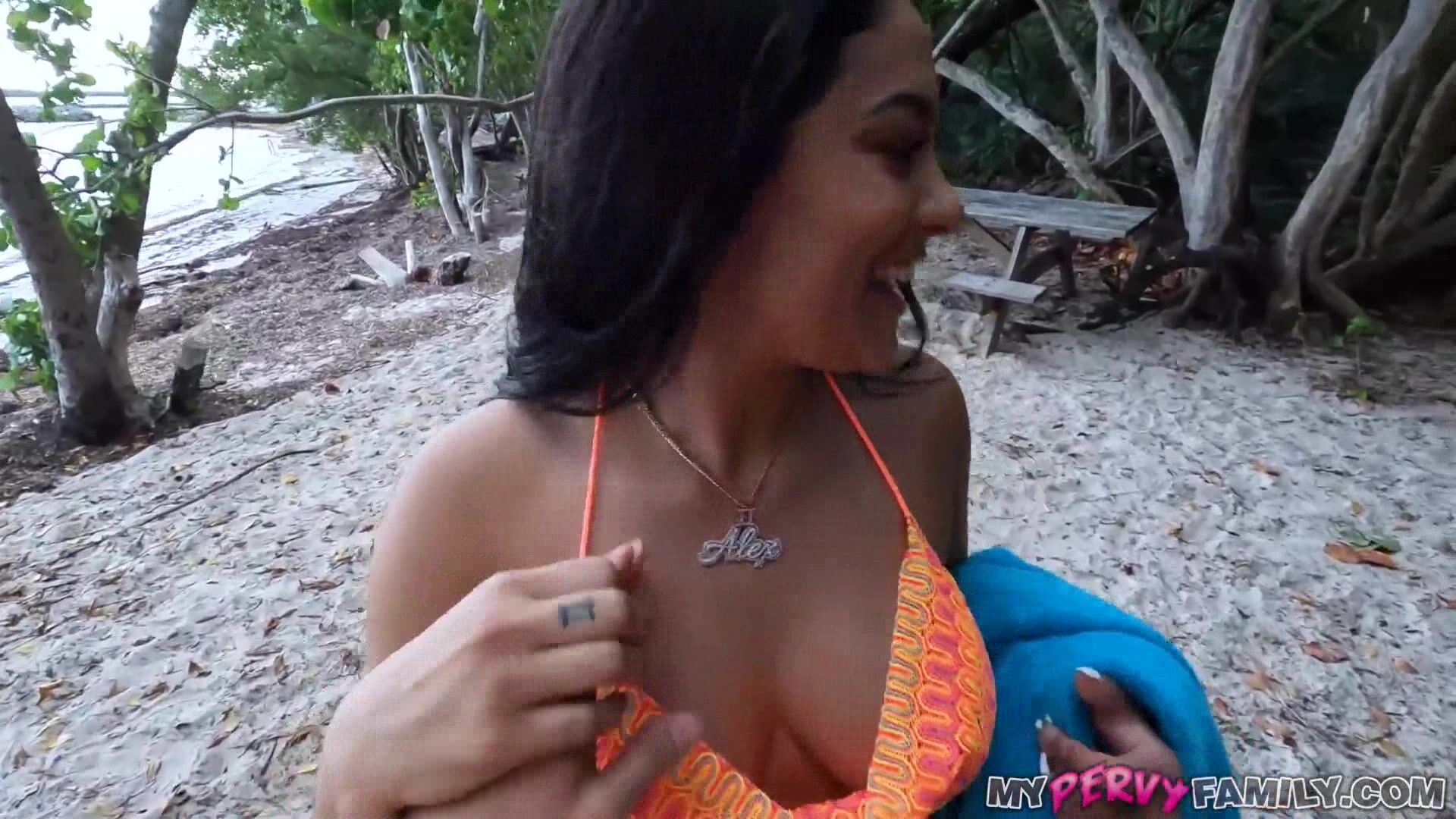 Busty stepsis shows me her boobs while dad in front of her