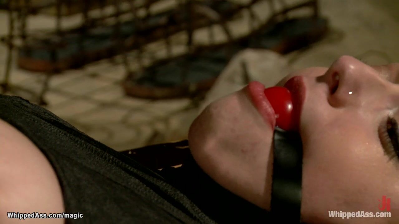 Bound babe Missy Minks in standing position with hands in box tie gets whipped then in doggy style position fucked by redhead huge tits MILF lezdom Mz Berlin