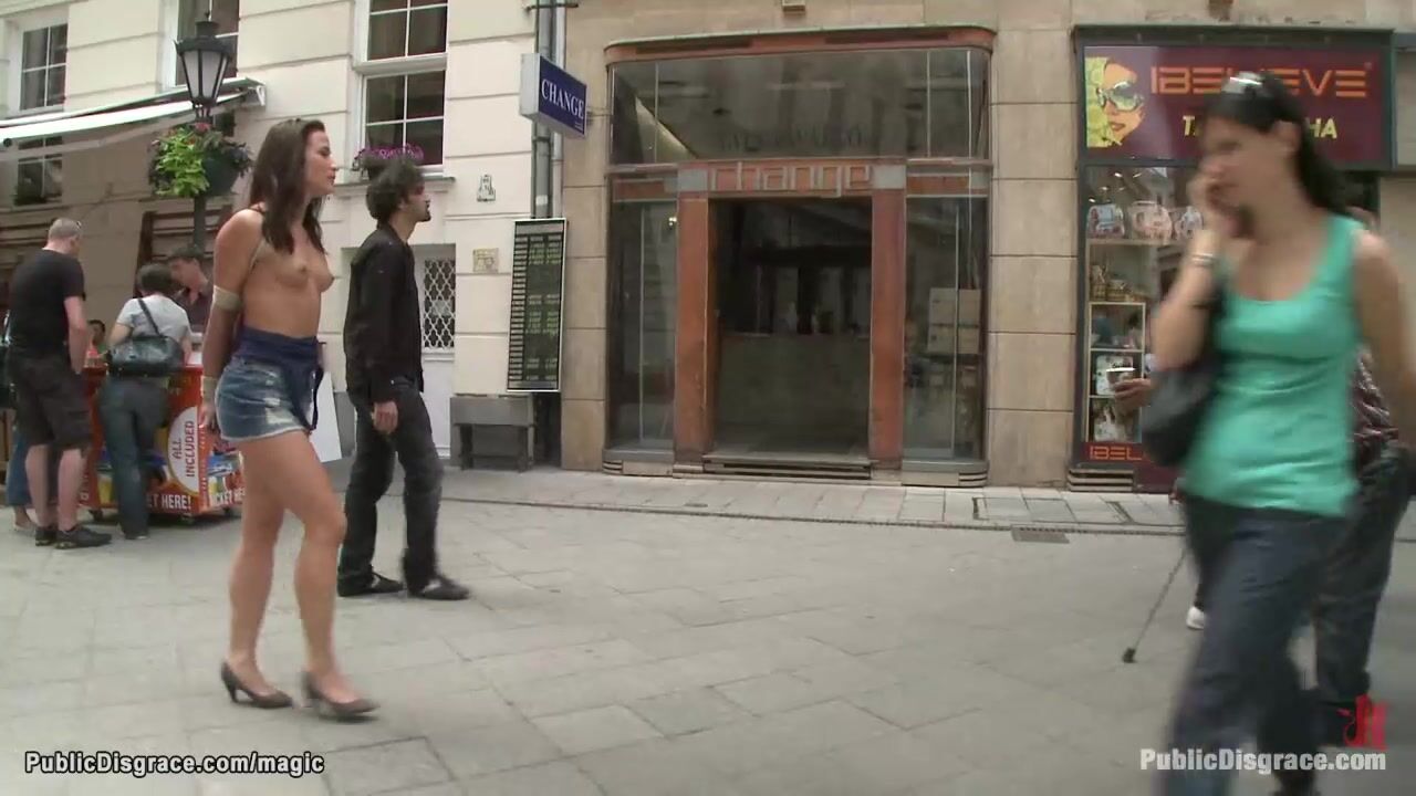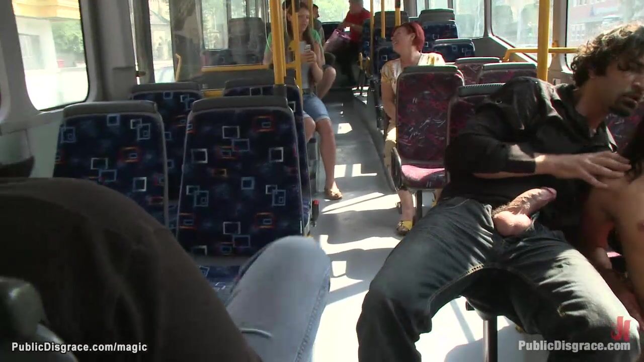 Bare boobs Euro brunette babe Niki Sweet with hands bound behind back walked through the crowded city streets then rough fucked in public bus by big cock Zenza Raggi