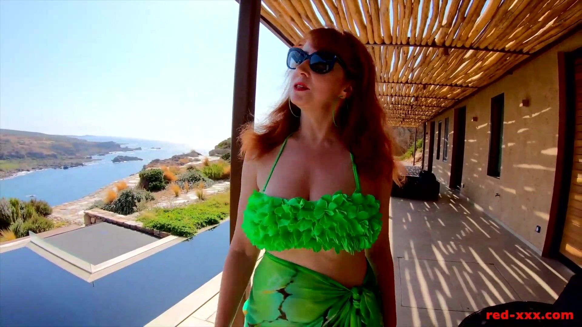 Busty redhead MILF Red XXX is on vacation at a place with an amazing view and just couldn't resist masturbating outside by the pool!