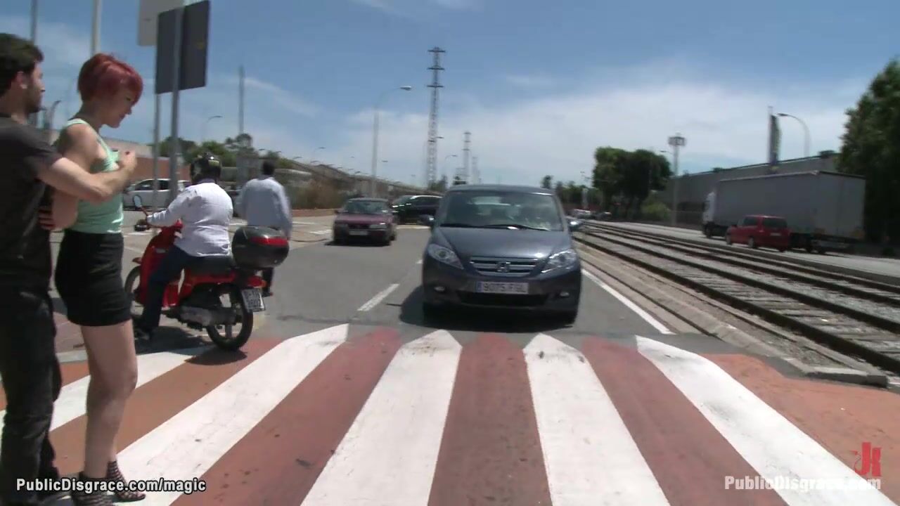 Red head Euro babe Yakima Squaw bound walked throug the city then throat fucked in squating position till big dick pussy fucked in front of strangers outdoors