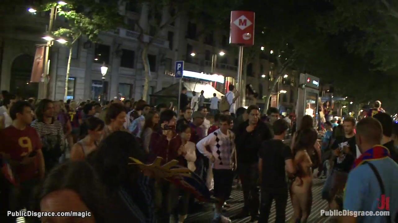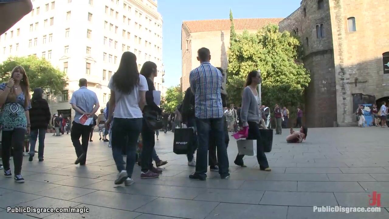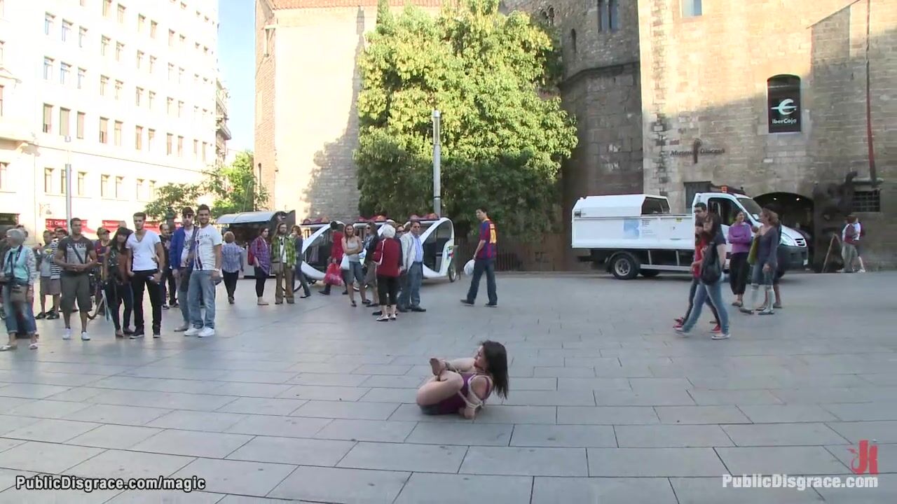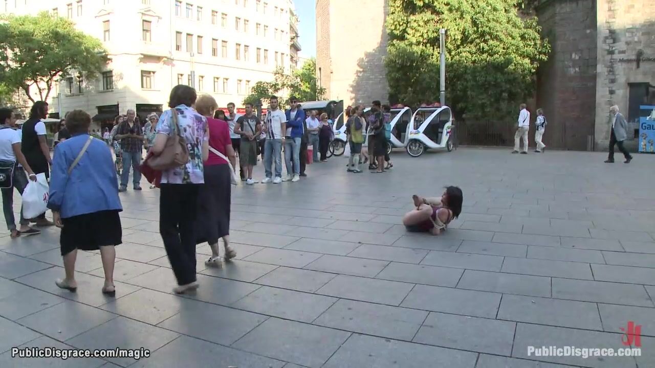 Little brunette Spanish slave Samia Duarte bound and exposed left on the ground in public place then fucked all over the city by big cock master James Deen