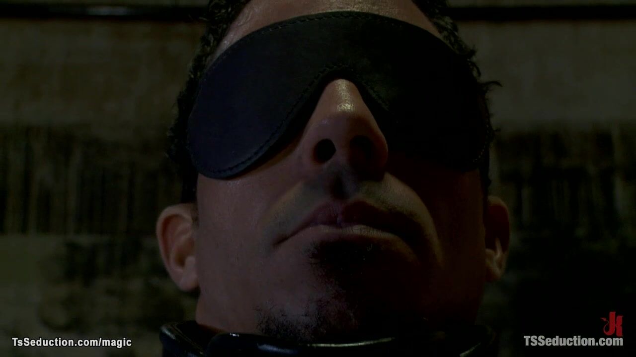Two super hot Latina women with big dicks Johanna B and Paris A have tanned muscle Lobo bound then with hard cocks then gang bang him while he is deprived of movement
