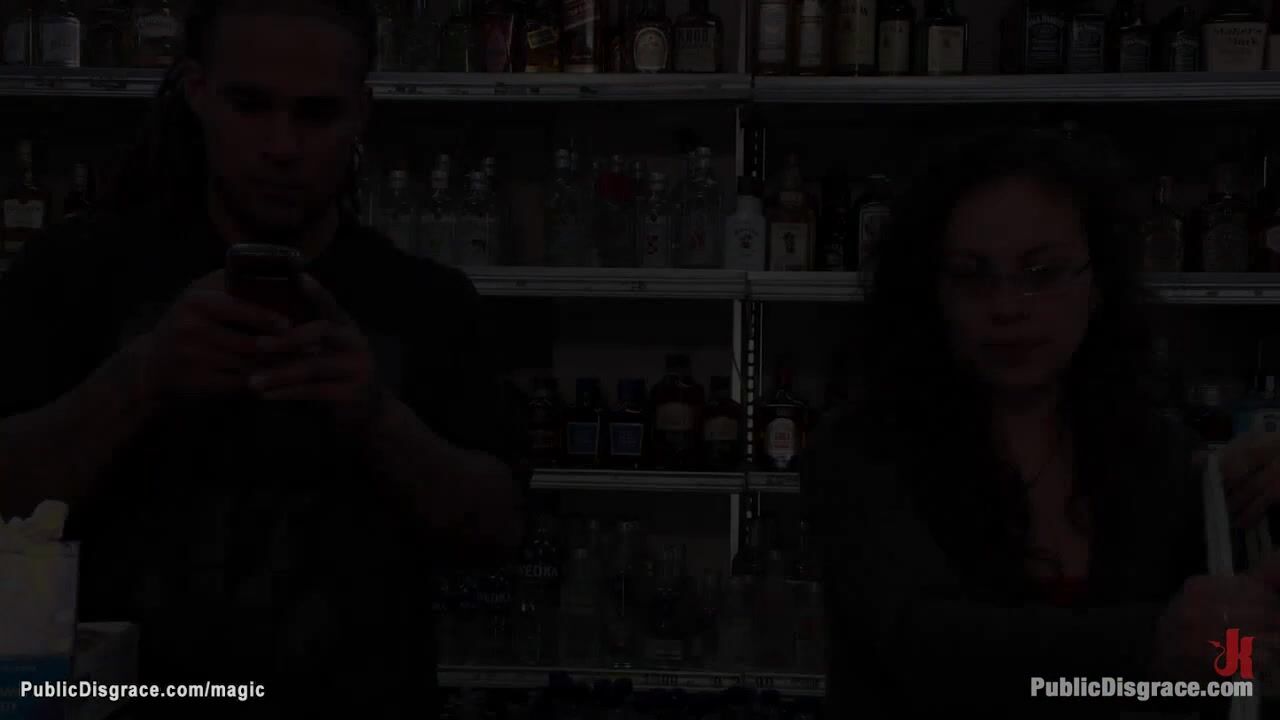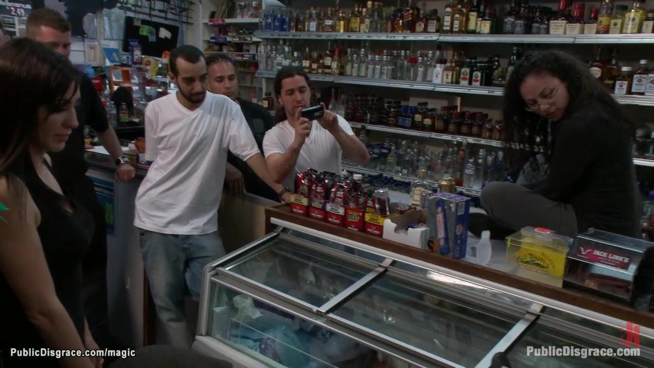 Brough in crowded store by dom Princess Donna Dolore and master John Strong tiny blonde slave Elaina Raye gets deep throat and pussy fucked in various positions in public