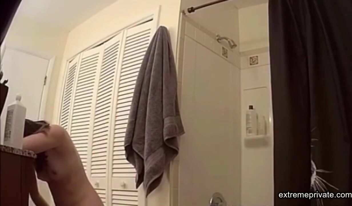 Before taking a shower, my stepsister (19) masturbates in front of the sink and watches her own face in the mirror as she cums. My hidden camera was there.