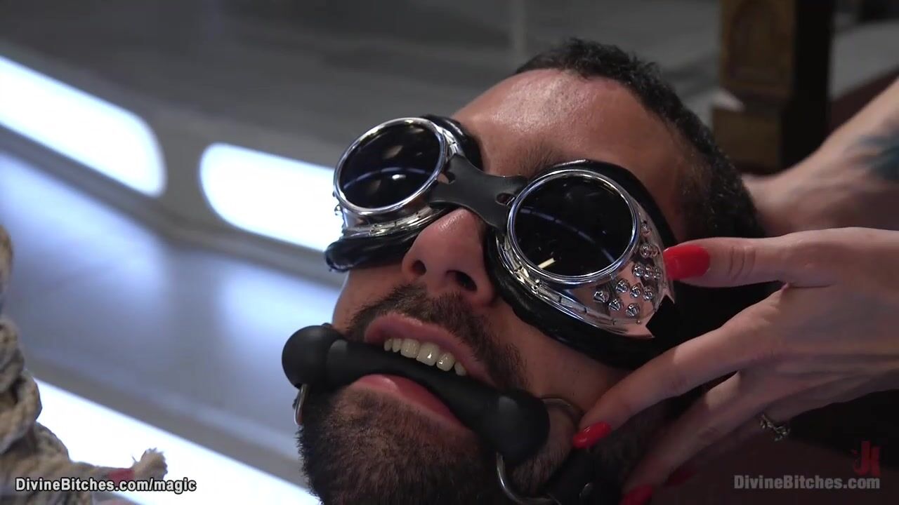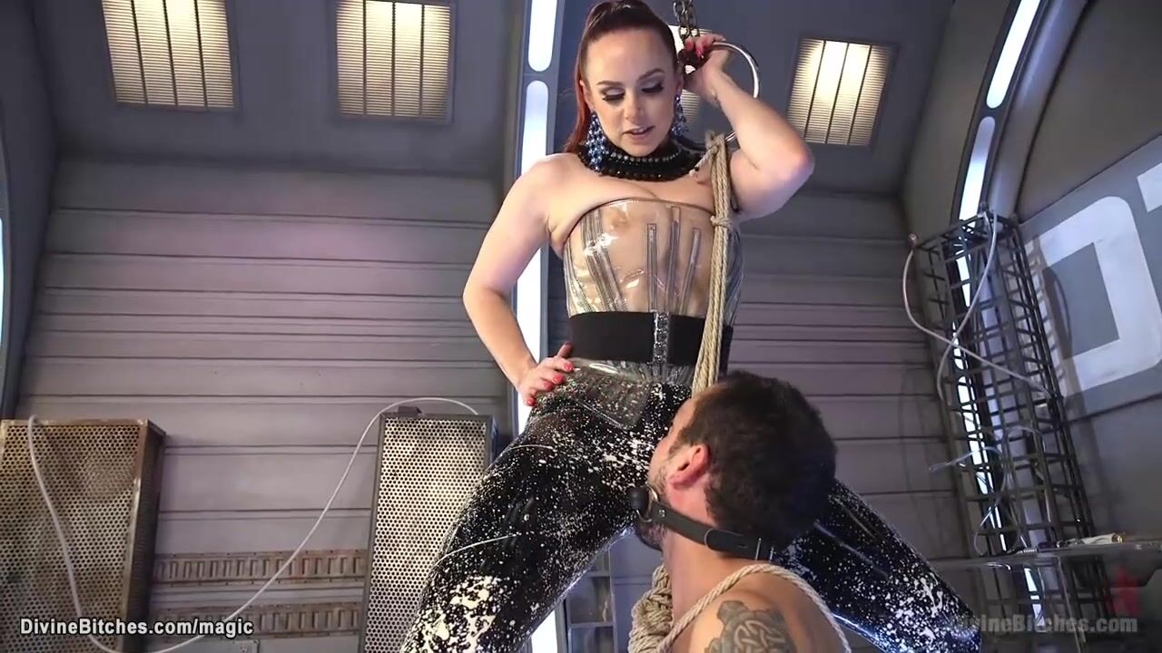 Red head mistress in latex Bella Rossi binds and teases her submissive DJ and makes him sniff her pussy then pegs him in doggy style position from behind then rides his big cock