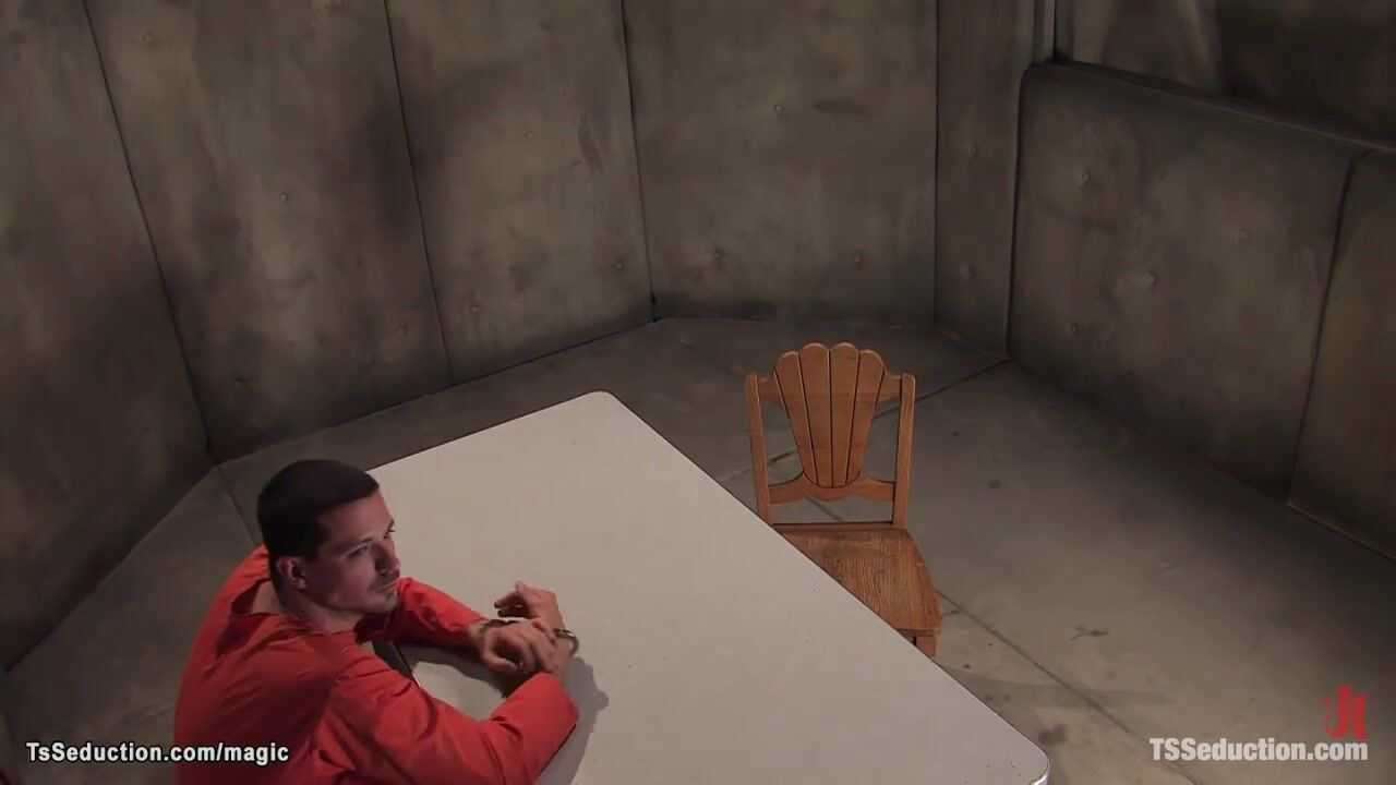 Big boobsblonde Latina shemale agent Jessica Host in interrogation room interviews deviant arrested man Kyle Sparks and with big cock anal fucks him on table