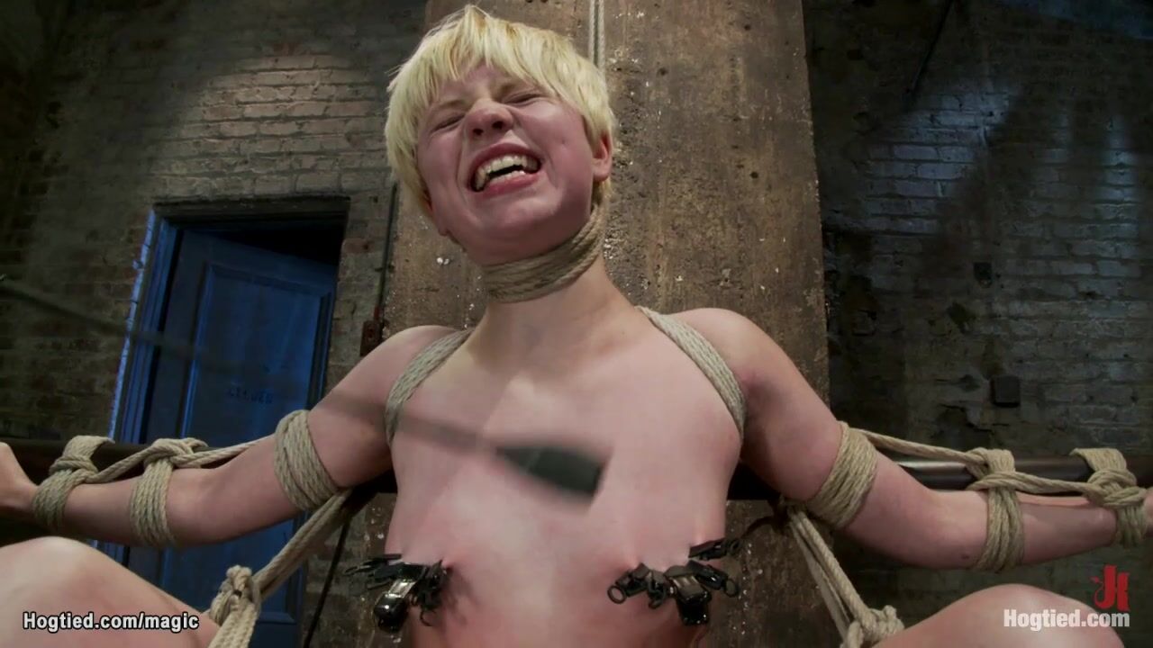 Blonde lesbian slave Alani Pi is gagged and legs bound to column in back arch position then hogtied and caned and anal fucked with dick on a stick by lezdom Claire Adams