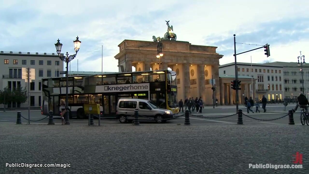 Bound and left nakes exposed in public Euro babe Blanche is humiliated then blindfolded in the park big cock fucked in doggy position by master Zenza Raggi