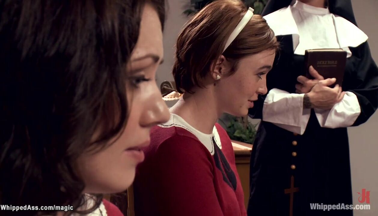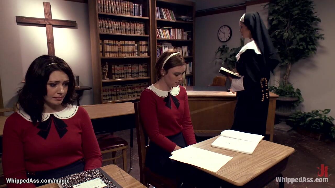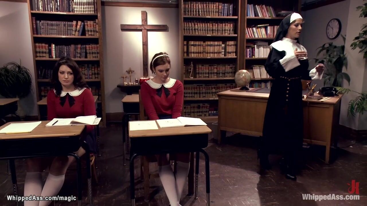 Huge boobs MILF nun Felony binds two coeds Jodi Taylor and Sarah Shevon and hard whips them then with strap on cock fucks on mattress in the basement of the Church