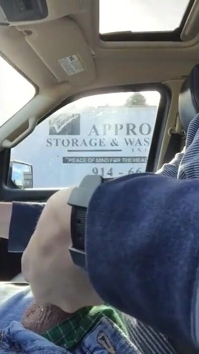 Jerking off and cumming while driving on highway. Pass several trucks and a tour bus full of people.