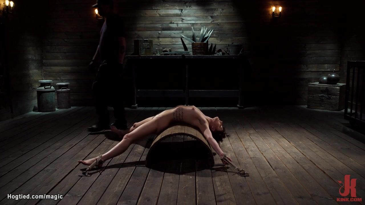 Hairy pussy brunette slave beauty Kristen Scott is bound spreaded in squating position to wooden pny and gets nipples and pussy clamped and weighted by master Johnpaul The Pope