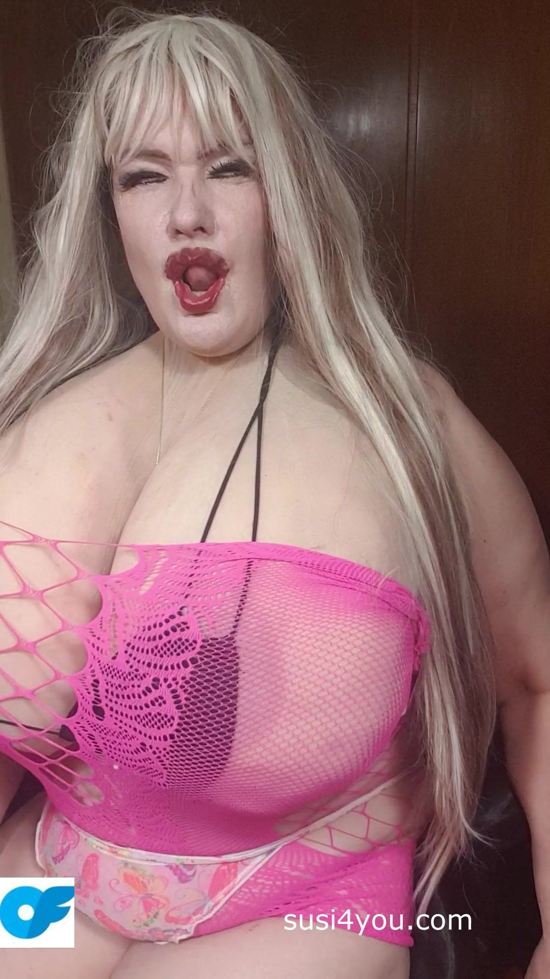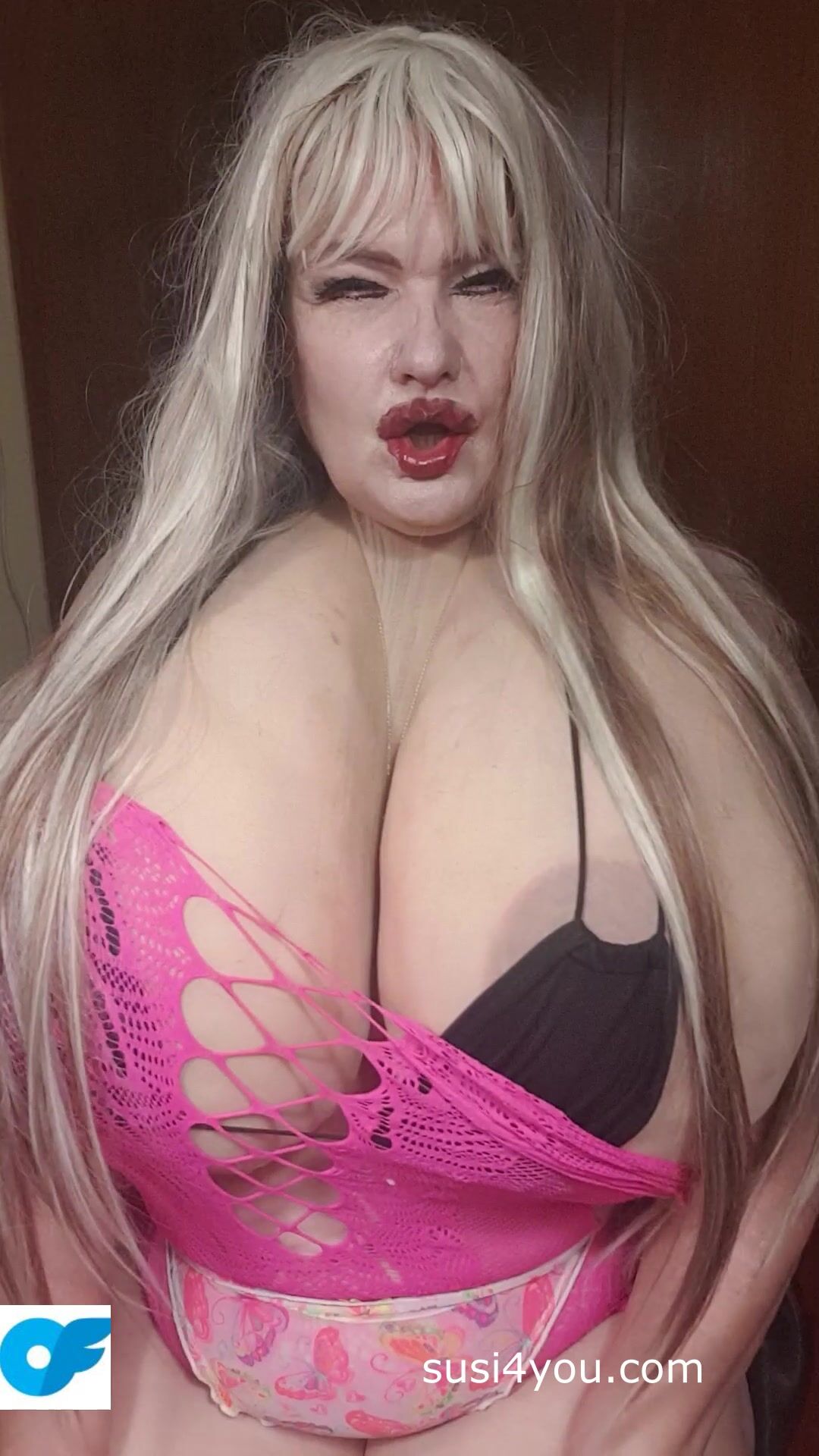 Look at Susi. She is taking her huge boobs out. She is rubbing her nipples put on nippleclambs She is teasingwith huge Cup K tits spreading her legs showing pussy