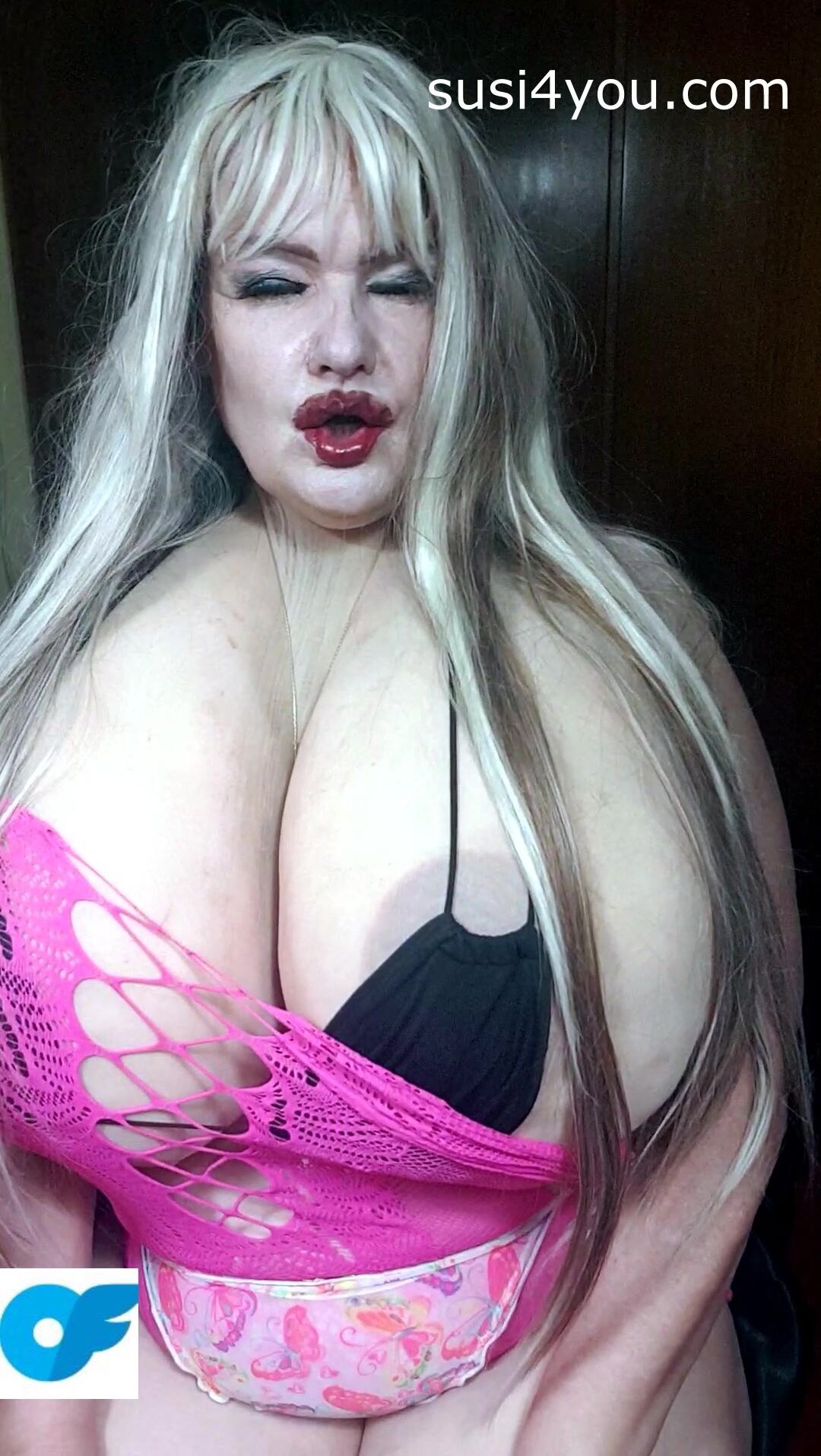Susi is bouncing her tits. You see her in pink fishnet showing big muffin pussy