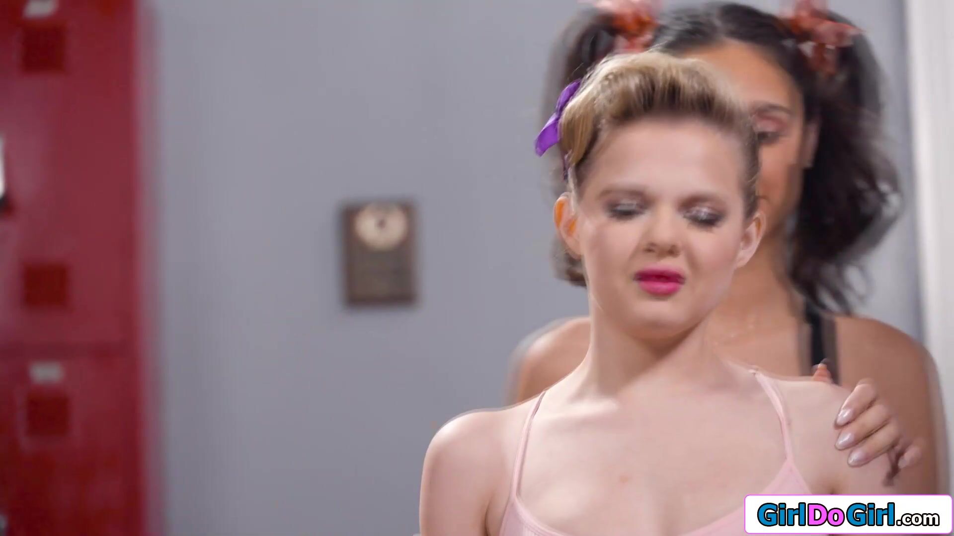 Rival cheerleaders kiss each other.The small tits latina lesbian gets her boobs sucked and rides her pussy against the petite blondes tongue to get oral.She then licks the babes wet snatch.The horny teens masturbate their cunts for a squirting orgasm
