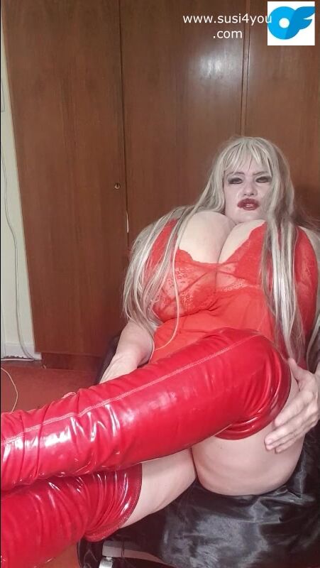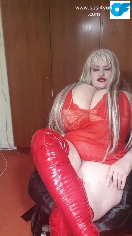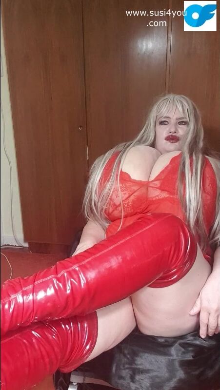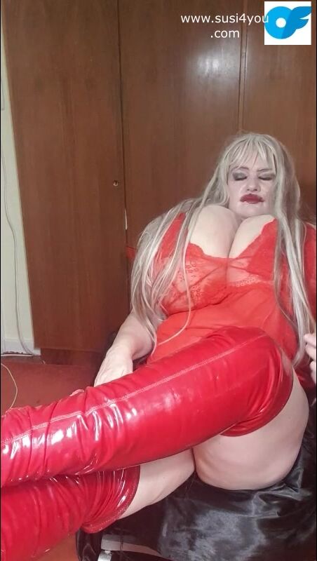 See this sexy Susi wearing red fishnet she is sitting on a chair showing her red