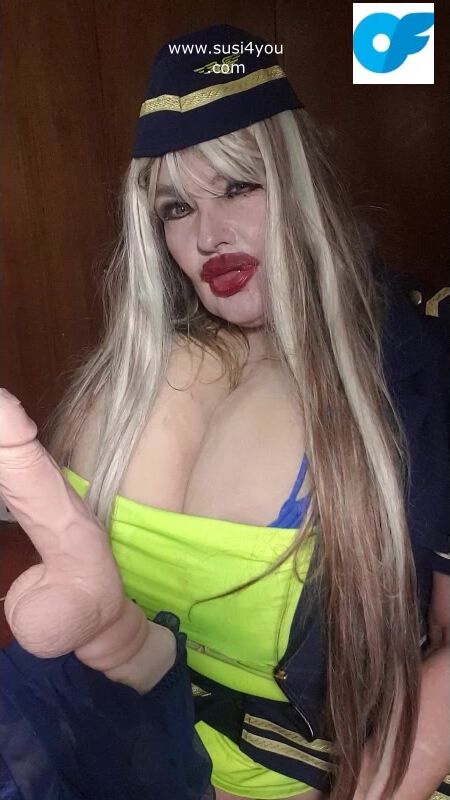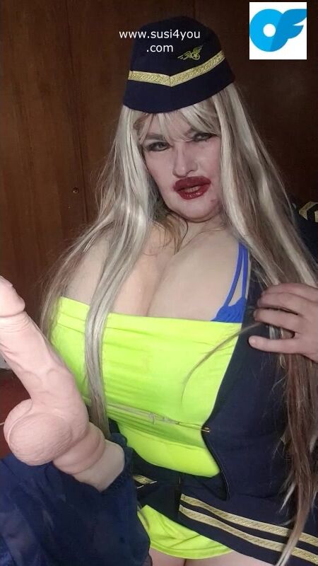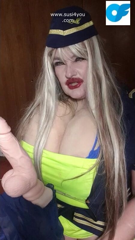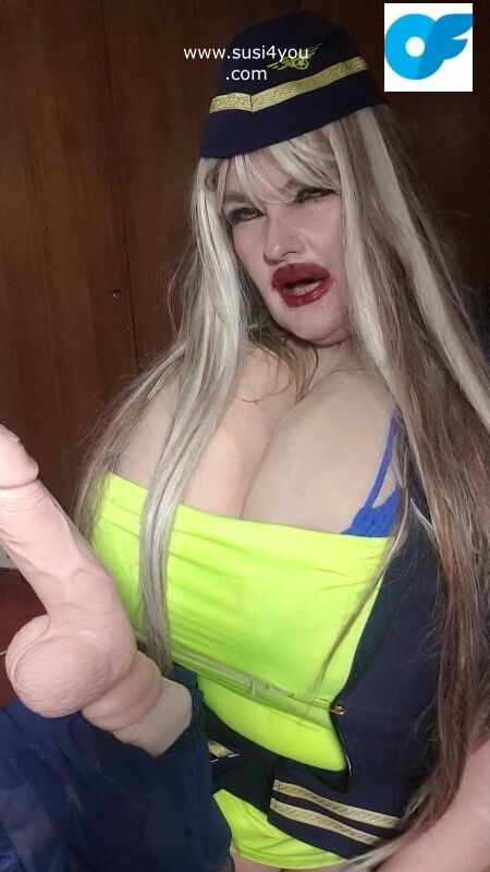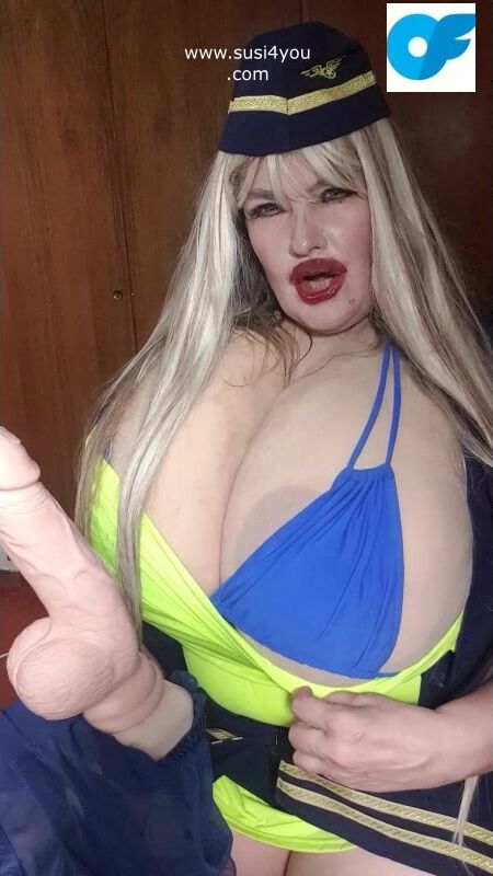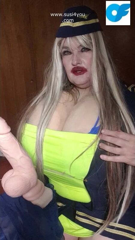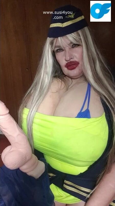 See susi i a nasty costume of a stewardess. She has a fat cock toy in front of her She is teasing you pulling out er tits# she is teasing you with her tits Then she is rubbing and squeezing your cock imagine... See the toy being worked by her dirrty stwardess playing giving you a nice joi