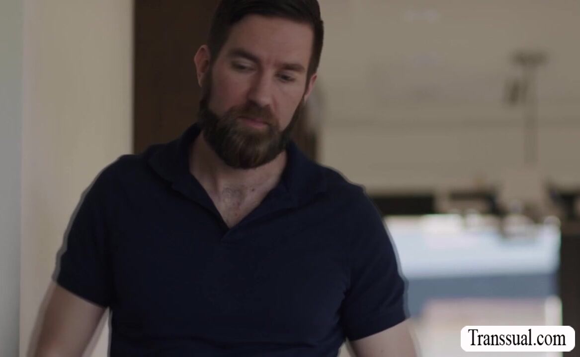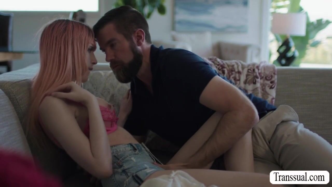 Pink haired TS comforted by her bearded stepdad on the couch.They start kissing each other and she then throats his hard big cock passionately.In return,her stepdad licks her ass first and she gets analed so deep and hard.