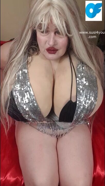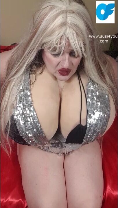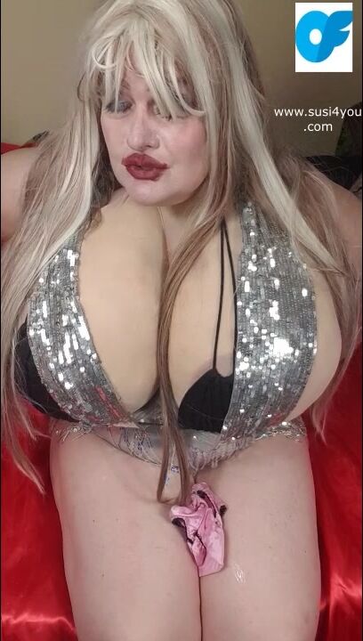 Lady with a silverscarf is on her bed Susi is taking a pink panty to stuff it in fat pussy Enjoy it and gimme all your cum She is spereading her legs showing her pussy and big tits so fat cup k size lic it suck it nasty horny boy.