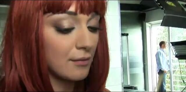 backstage of a porno shoot with a hot red haired trying double penetratio for first time