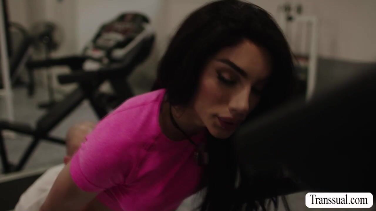 Horny bald dude cant resists the super hot TS working out in the gym.He rips off her leggings and licks her ass to makes it wet.In return,busty TS throat his hard big cock passionately and lets him bareback fuck her wet ass.