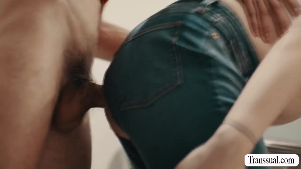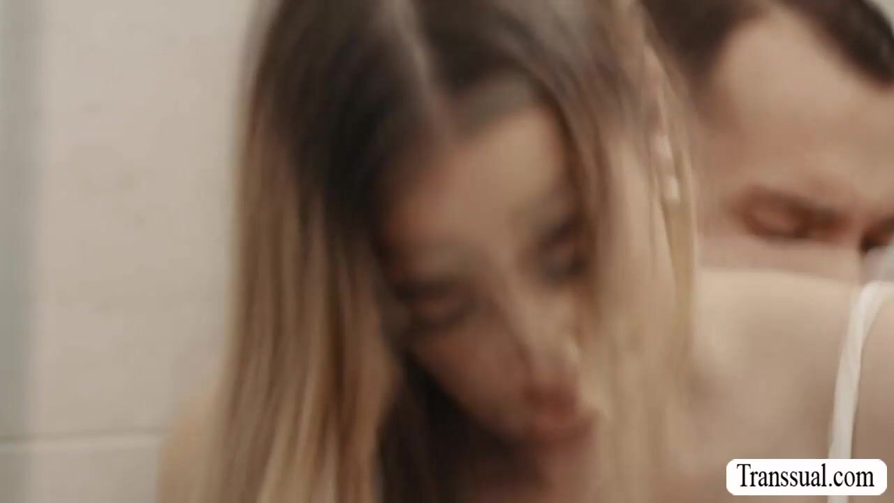 Horny dude fucks the ass of their TS babysitter while shes doing laundry.After that,they move into the bathroom and they get caught by his wife.Instead of stopping,he licks her ass first and he fucks it again.