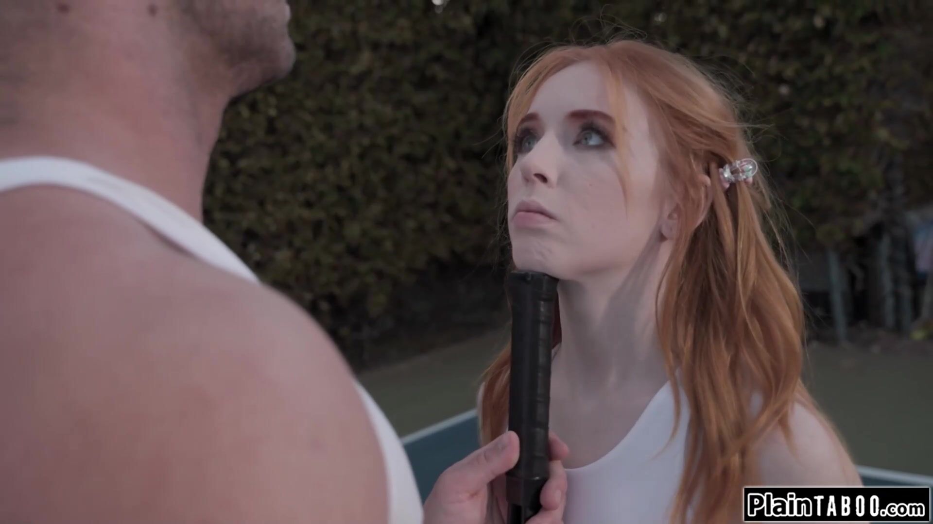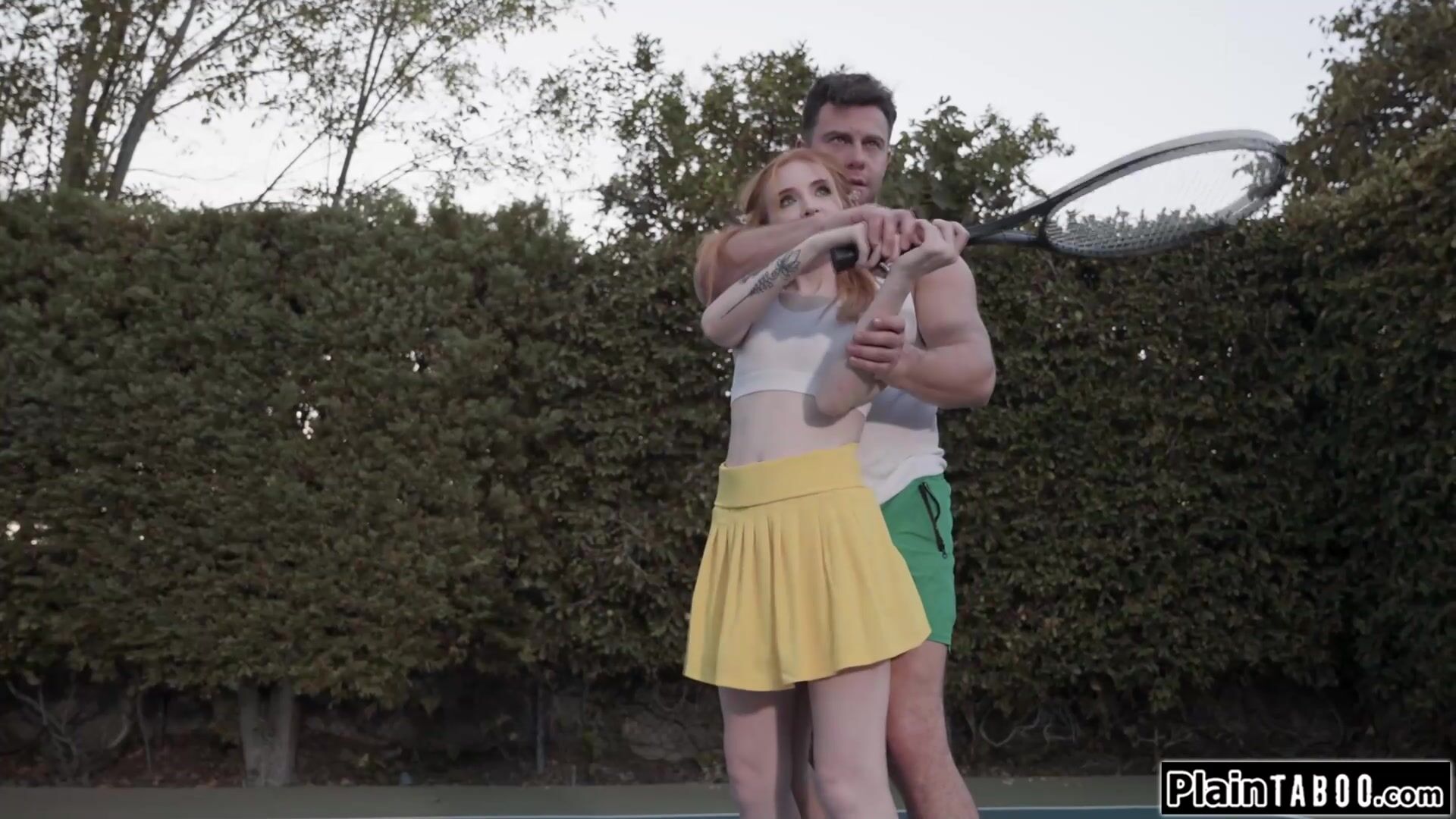 Tennis coach starts kissing his petite redhead student while practicing her forehand.He lifts up the small tits gingers skirt and eats her pussy.Inside she deepthroats his big cock and gets oral.She rides cock and is banged until she squirts