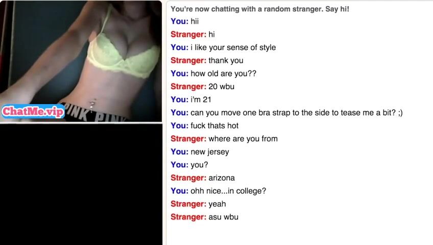 Slender young babe masturbating with a stranger guy while chatting. She is staying completly naked,showing her sexy young body with belly piercing and small tits.