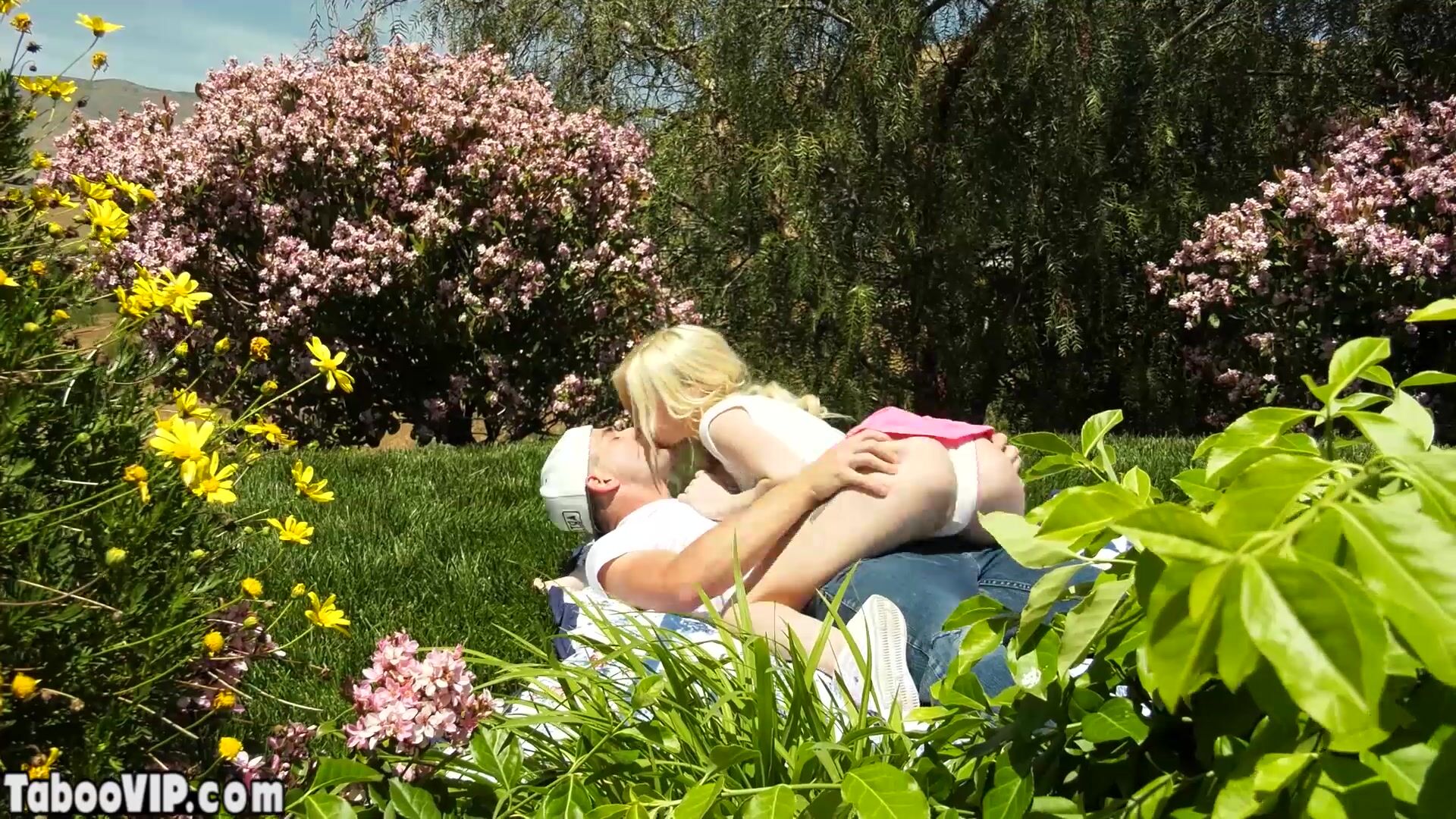 Petite blonde teen stepsister with small tits is in love with her stepbro She takes his big cock at the backyard outdoor and after a sloppy deepthroat blowjob he is fucking her fresh pussy roughly