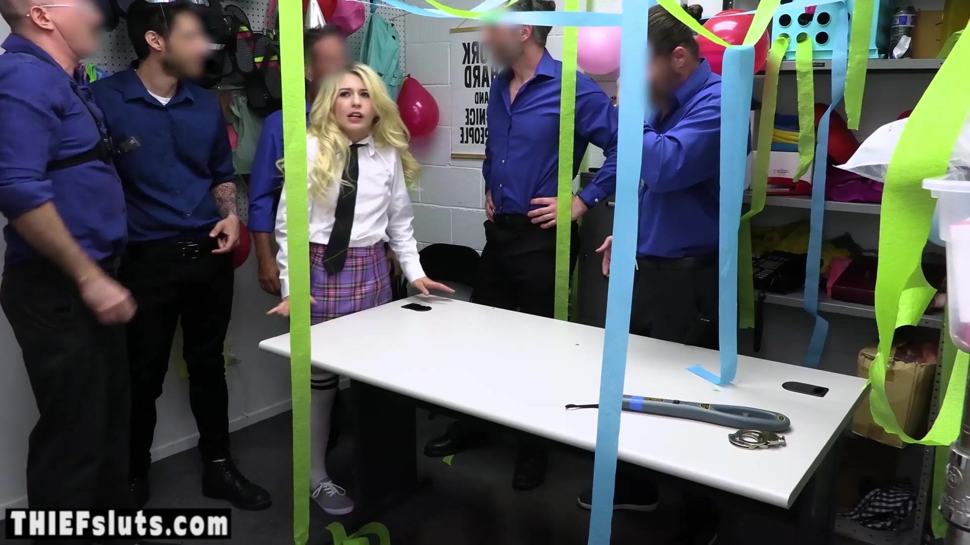 LP officers are celebrating birthday and the guys take a scared petite blonde teen thief Minxx Marley with small tits to surprise their associate then the five guards are group fucking the hot slut roughly