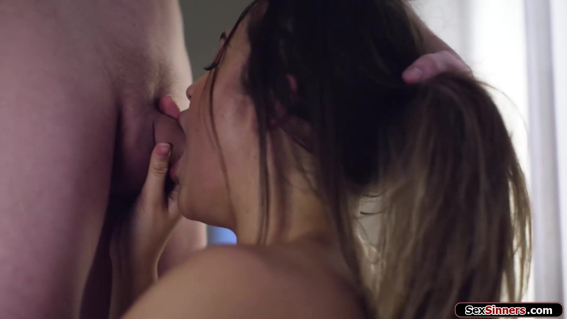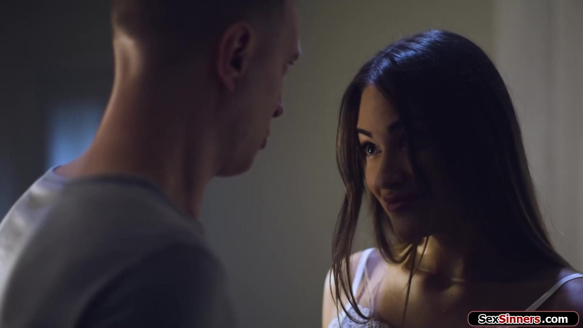 Babe confronts her gfs stepbro peeking and starts kissing him in the hallway.The brunette takes his dick out to deepthroat.He licks the small tits babes pussy before banging her next to his stepsisters bedroom.She handjobs and blowjobs him again