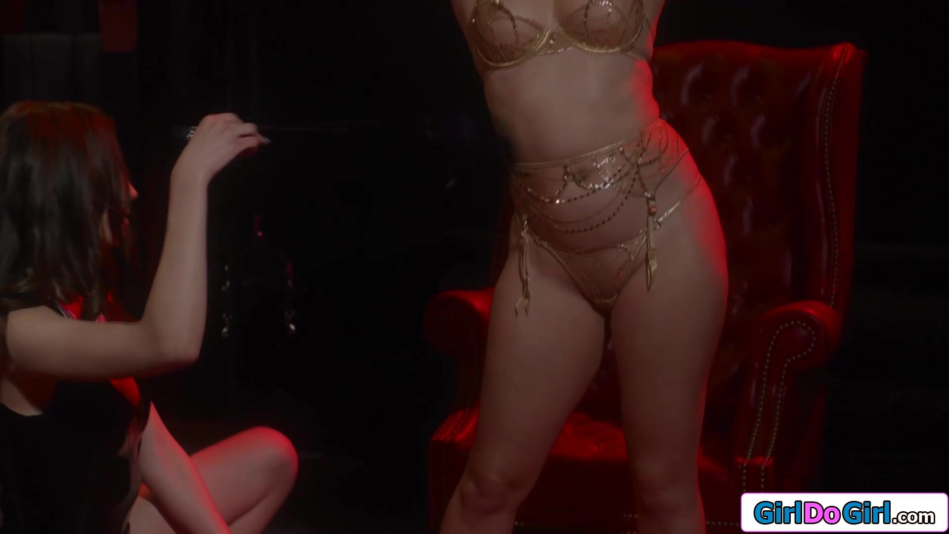 Lesbian mistress Maya Woulfe spanks her handcuffe petite sub Leana Lovings.The small tits brunette tickles her with a feather and paddles the babes big ass before letting her lick her pussy.She gives her oral as a reward and finishes with a whip