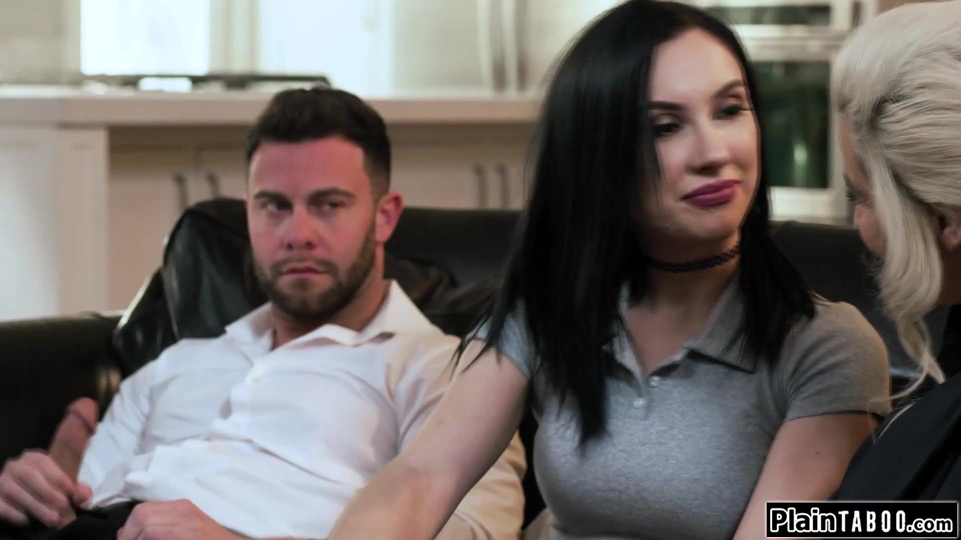 Could you tell me why your cock is out on my job interview.Clearly I misunderstood the terms but since I really need this job I will have sex with you both.After I deepthroated the busty milf boss lady wants me to lick her pussy while getting banged