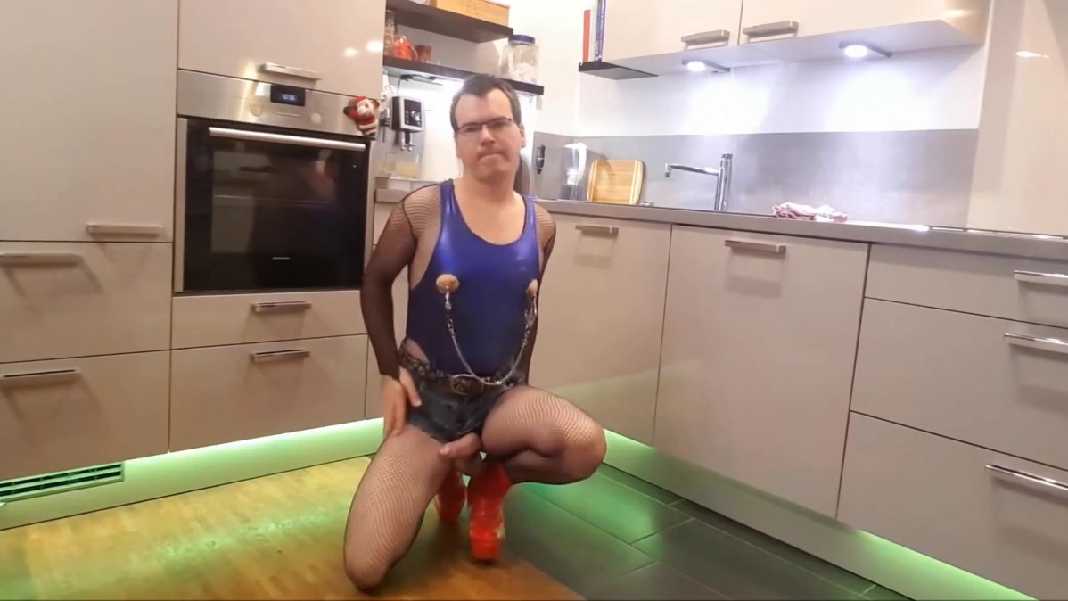 Sissy Bitch in Jeans and Leotard Swimsuit clean up the kitchen
