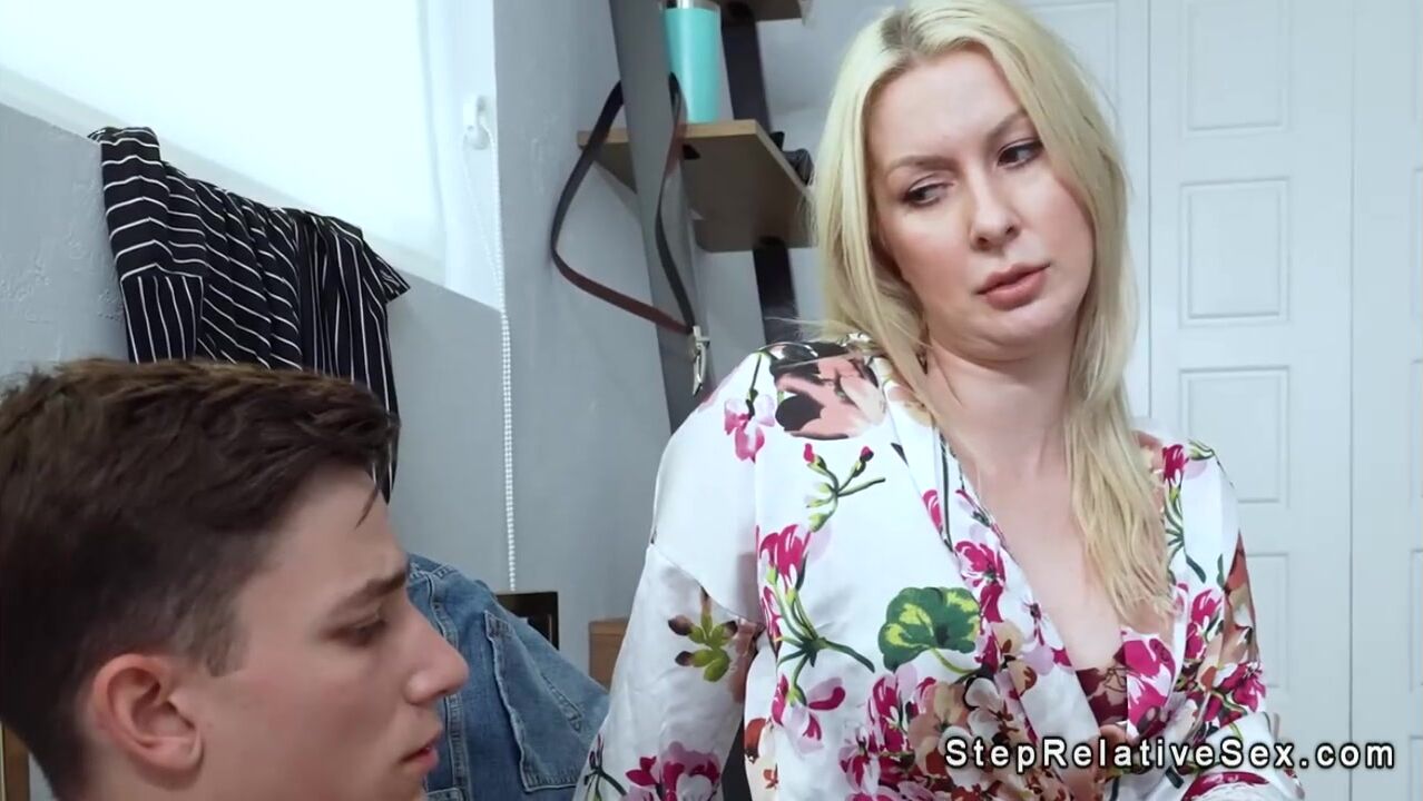 Big tits pale blonde Milf stepmother Sydney Paige caught stepson Parker Ambrose with boner then fucked him in reverse cowgirl and other positions in bed