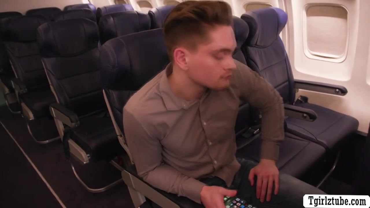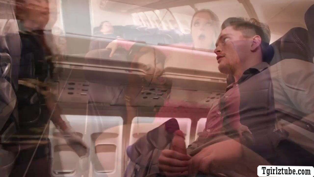 Slut TS flight attendant lets her chubby passenger suck her hard shecock in the plane.After that,she fucks her pussy so deep and hard.Next is,she grabs the guy on his seat and brings him into the comfort room and do threesome sex.