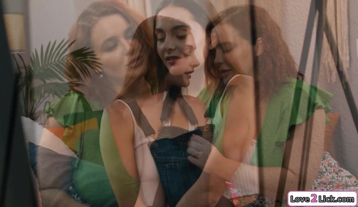 Curvy stepmom bought a mirror for petite stepdaughter and seduces her to fuck ifo it.They kiss and the older redhead pinches her small tits.The brunette sucks her big tits and facesits the busty milf.The babe rims her as she fingers her hairy pussy