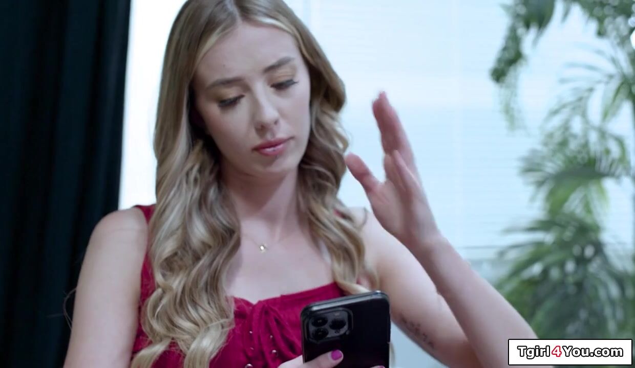 Tattooed trans Gracie Jane and a model decide to fuck to pass time.They kiss and the busty shemale sucks her small tits.The big tits tgirl fingers her pussy as she gives her oral sex.The blonde babe rims the tranny and sucks her cock.The ts bangs her