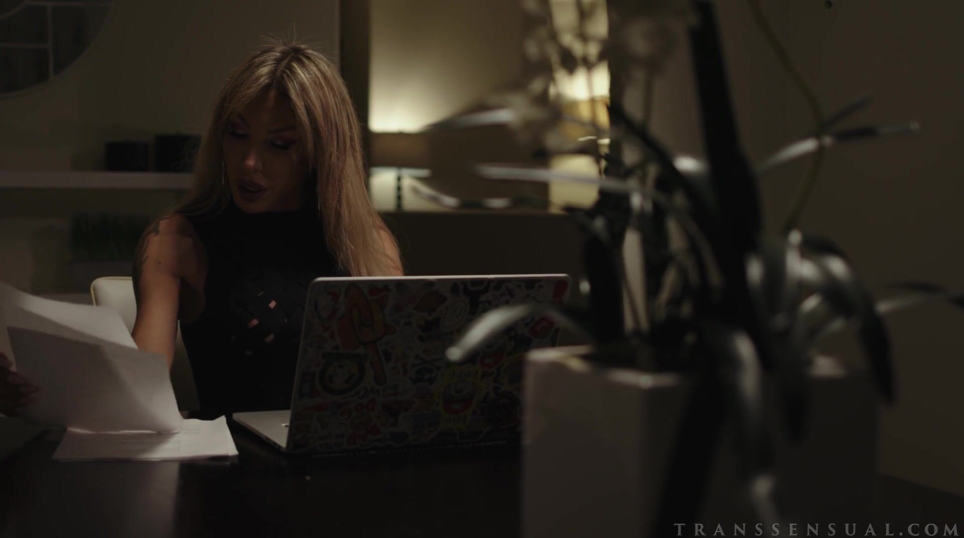 Busty shemale Eva Paradis deepthroats and barebacks stepson