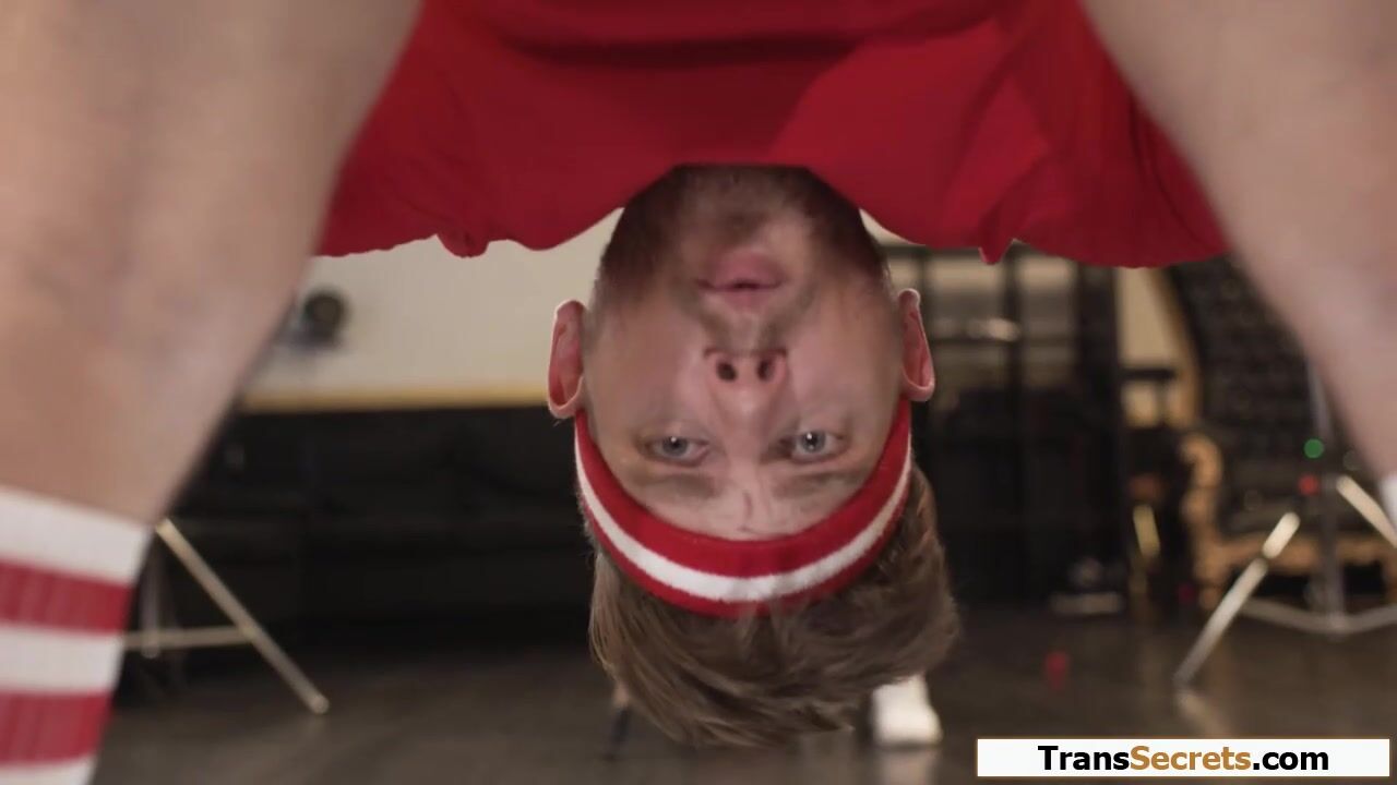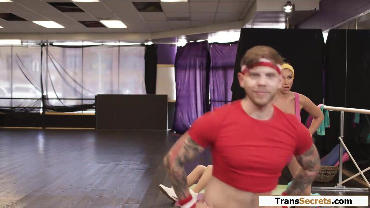 Trans fitness babe Gracie Jane fucks busty brunette during workout behind the instructors back.He joins and the big tits tattooed shemale and her classmate suck his cock.The tgirl is facesitted while deepthroated.Then the tranny bareback anal rides