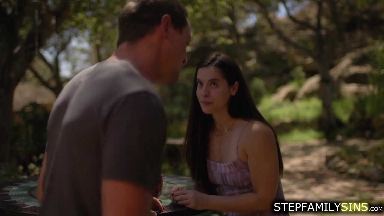 Brunette Abbie Maley is alone in the family camping with her stepcousin.The guy is teasing her until she gives in.They start kissing and getting naked.She goes deepthroating his big cock then he licks her shaved pussy in return before they fuck