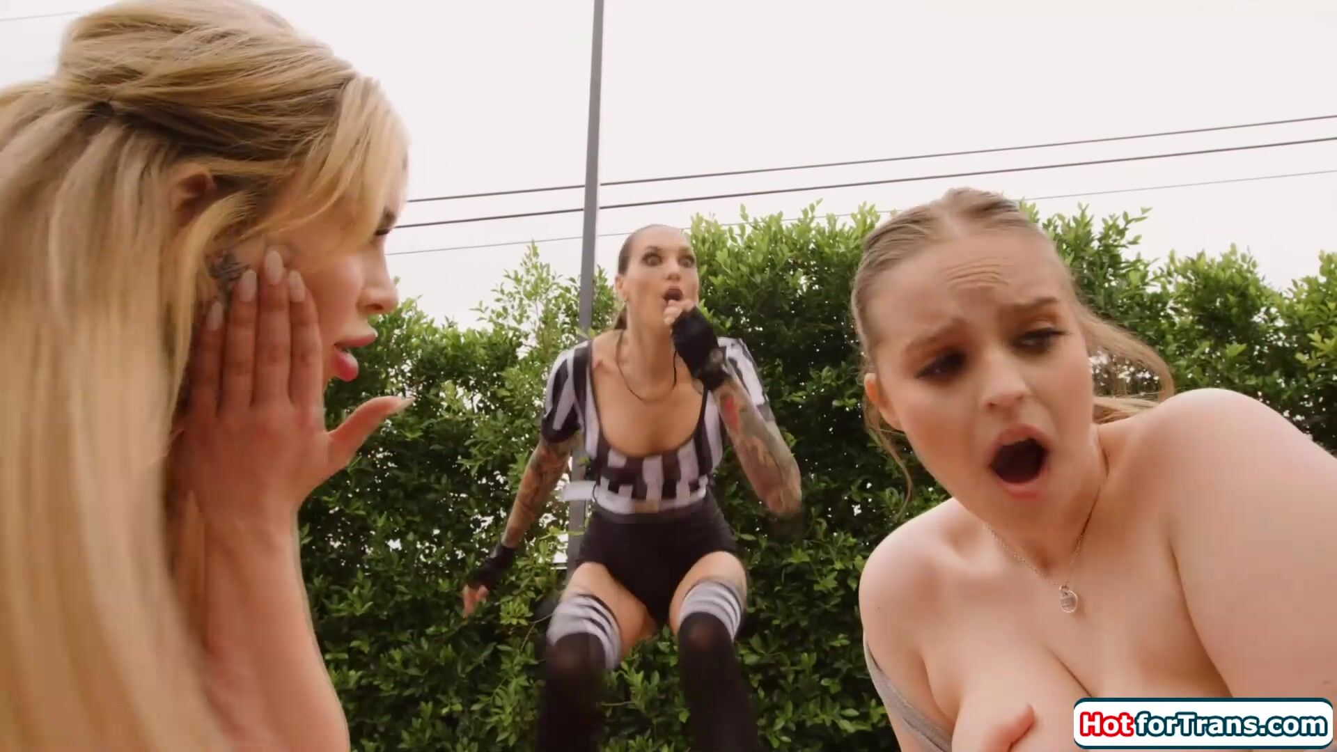 Milf referee Rocky Emerson has send busty trans Gracie Jane and chubby babe Codi Vore inside.Codi sucks on the tgirls dick and the brunette milf joins.The babes deepthroat the tattooed shemale and the ladies lick while the tranny bangs a pussy