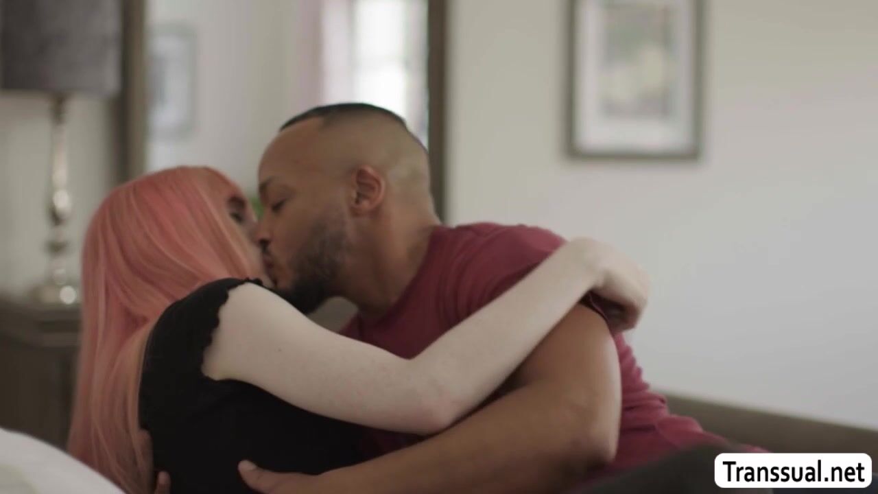 Shemale babe Mimi Oh and her black stepbro are on the bed kissing each other.After that,she throats his big black cock passionately and in return,her stepbro licks her ass first before he bareback fucks it so deep and hard.