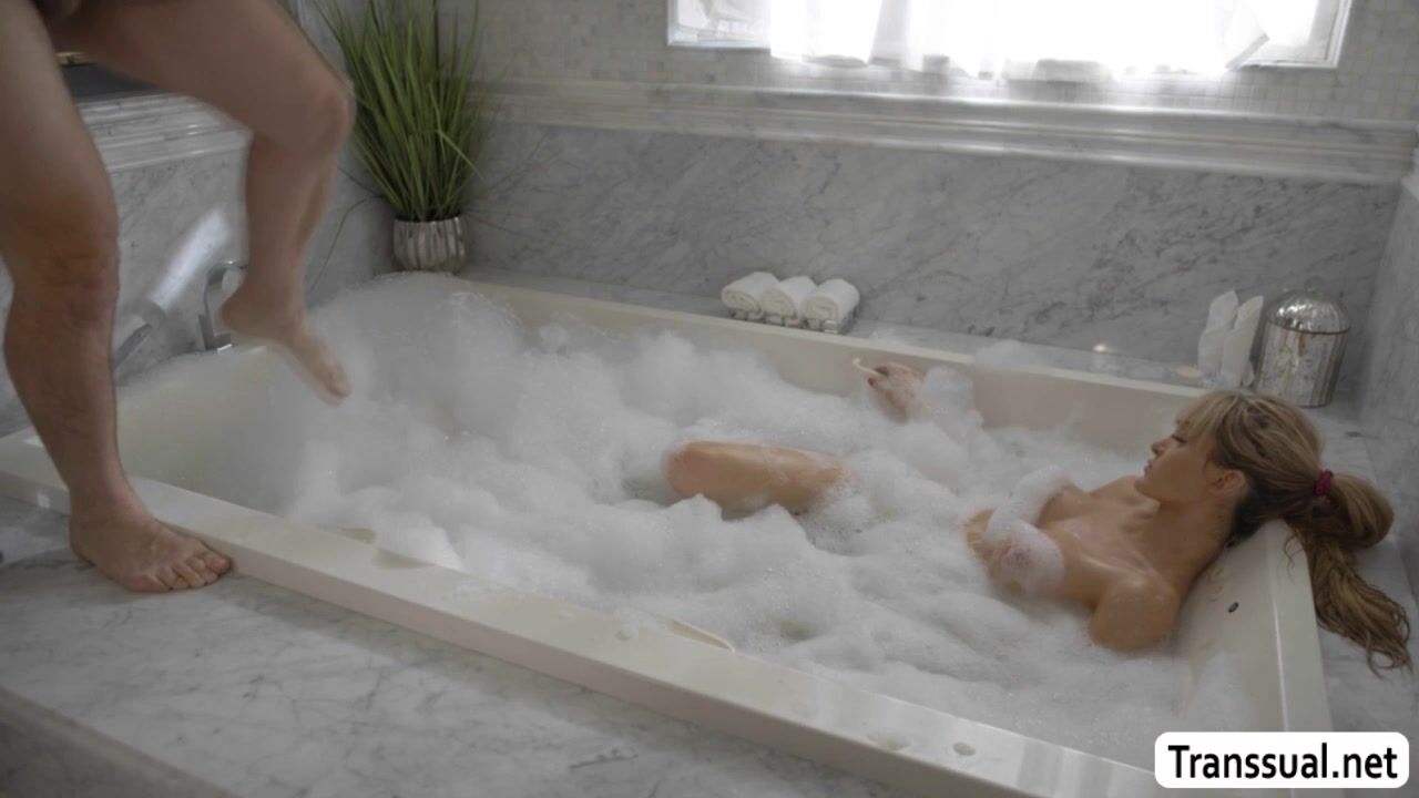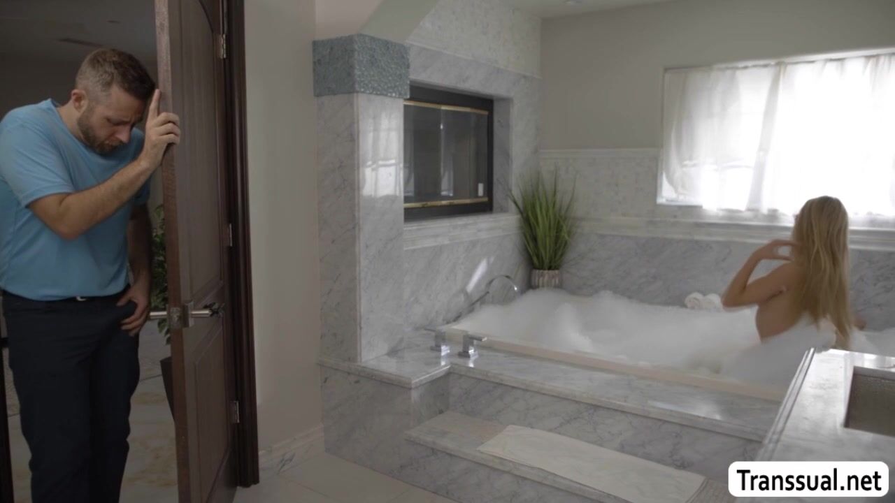 Perv dude Joel Someone watches the TS girlfriend of his friend Tori Easton in the bathroom while getting naked.After that,he joins her on the bathtub and they start kissing each other.Next is,he lets her suck his dick before he fucks her ass.