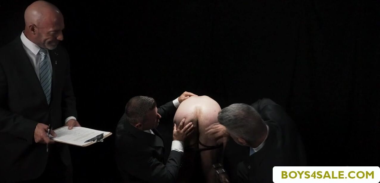 Muscled old buyers checking the twink gays body,ass and dick size.This incredible teen managed to take all those big cocks? are you kidding me?