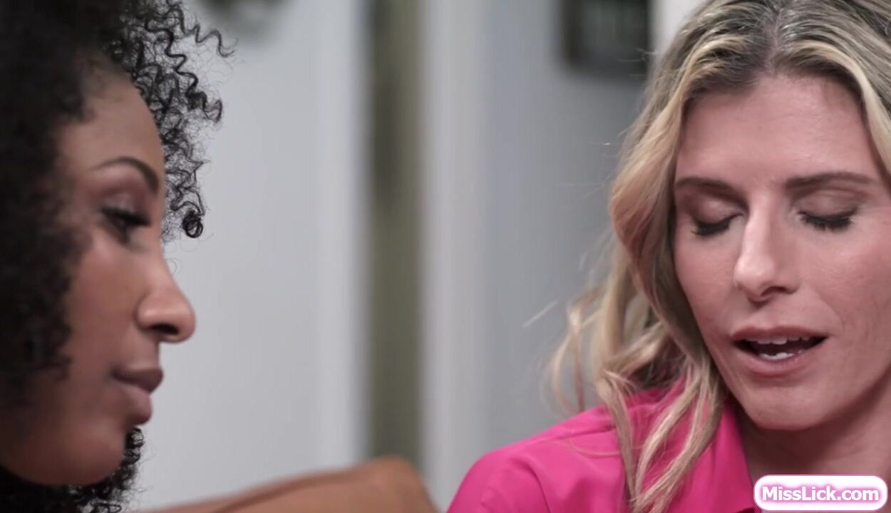 Ebony stepdaughter Olivia Jay is worried about the lesbian exam for she has no actual experience.Her blonde stepmom Cory Chase is teaching her how to kiss and lick pussy.The black babe gets so horny as she goes on scissoring with the big tits milf