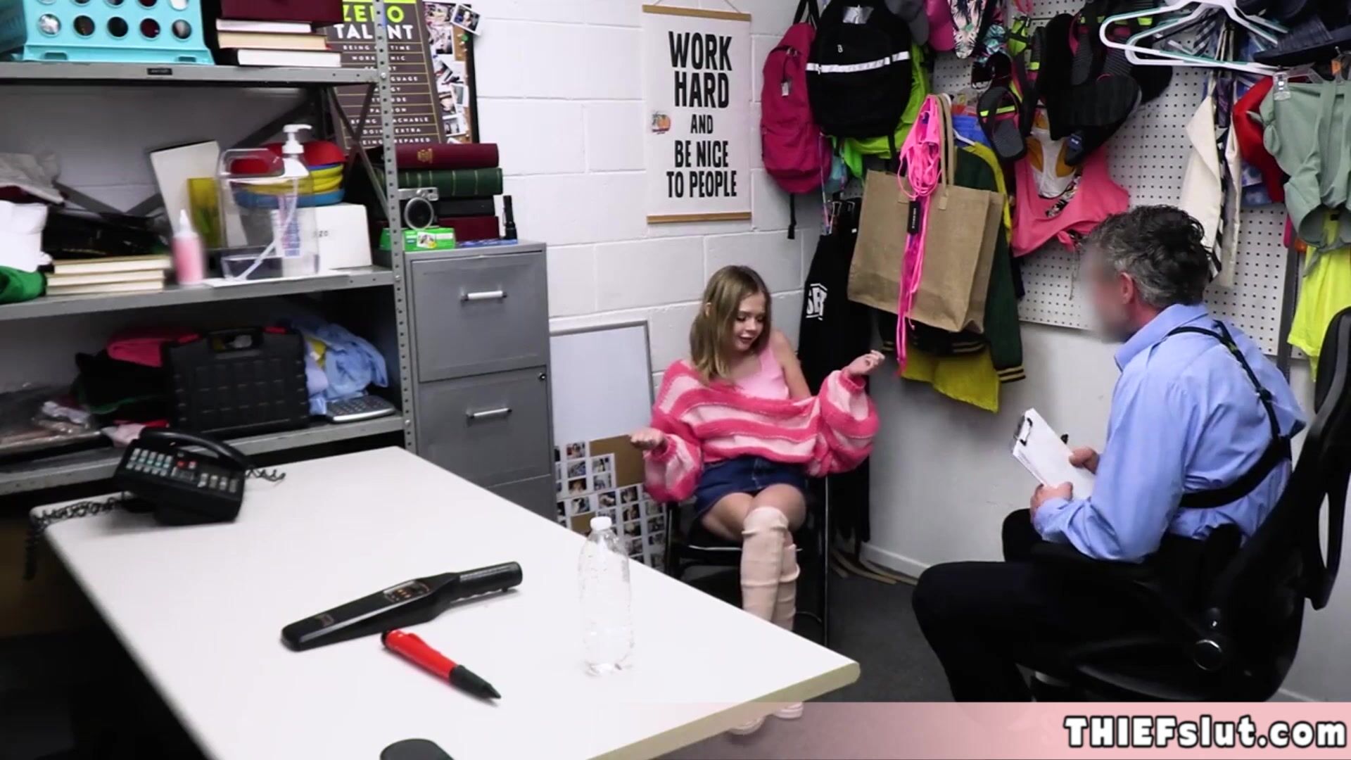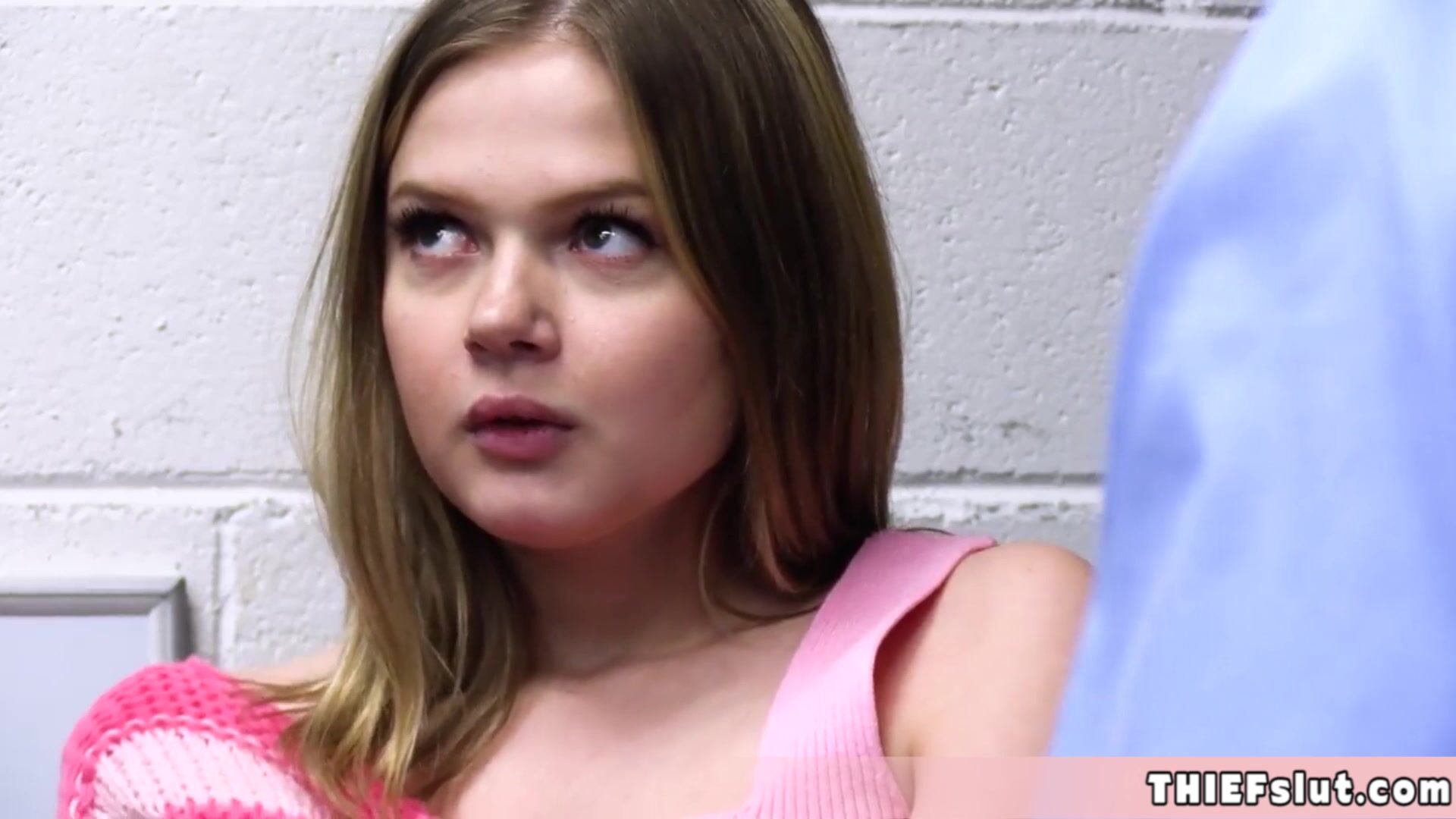 Cute faced shoplifter Coco caught in the sex shop and now she must offer her tiny pussy for the mall cop