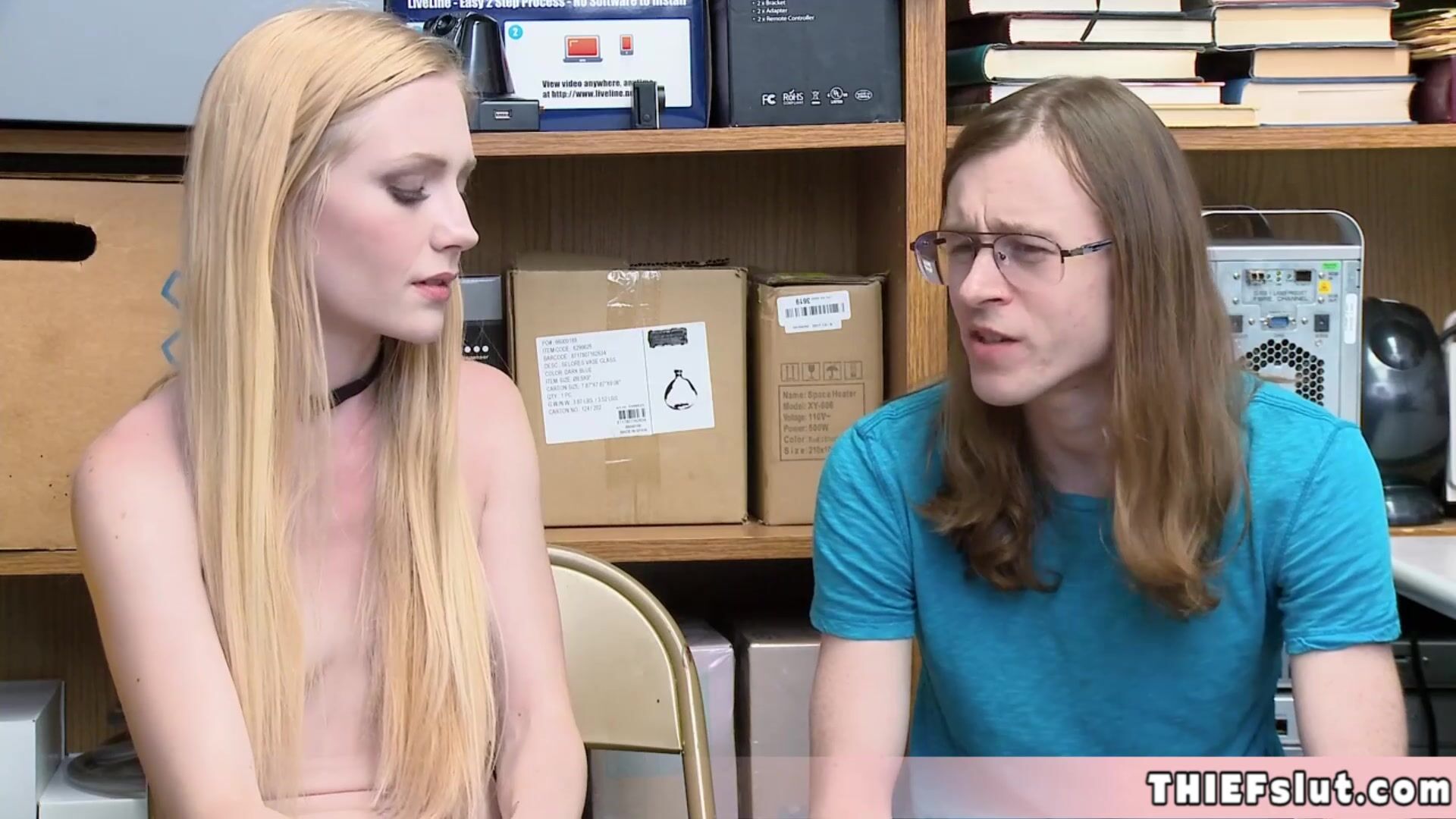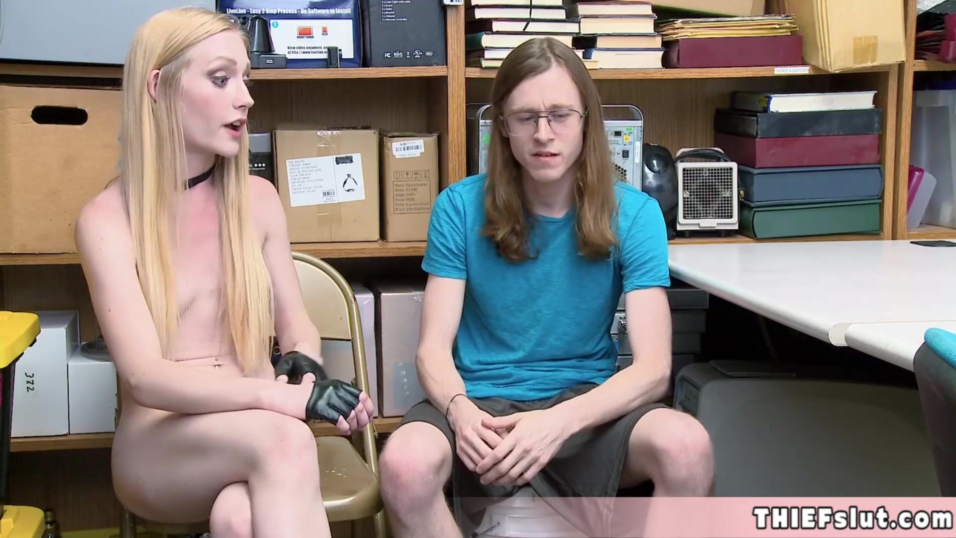 She was caught while shoplifting and now her BF must watch as they destroy her tiny teen pussy in the security room