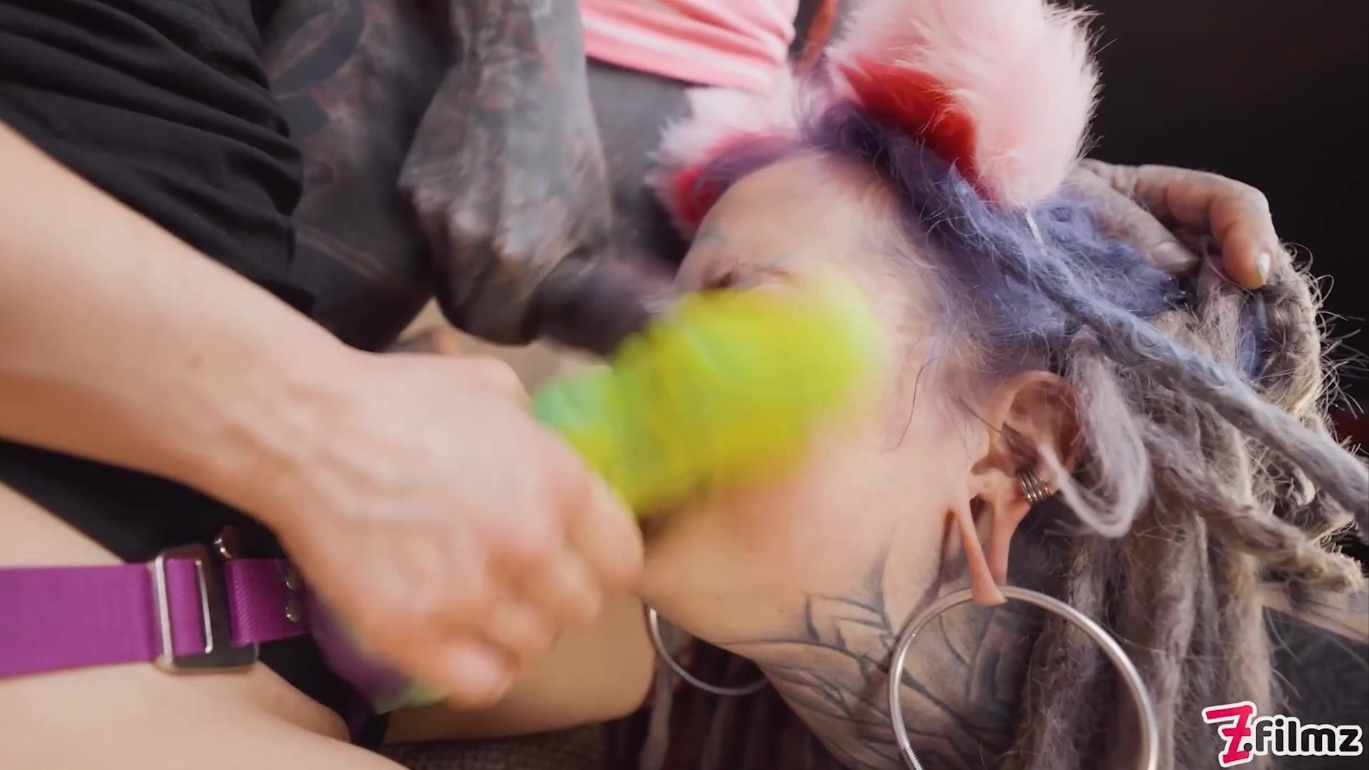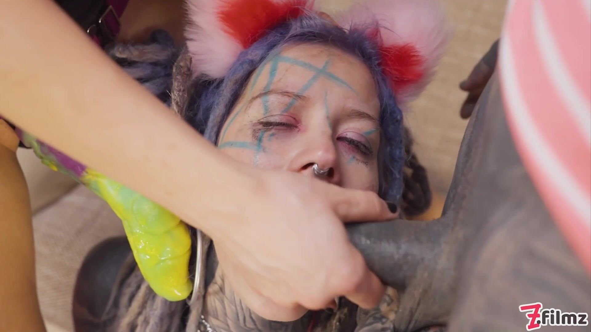 Tattooed catplay girl double blowjob